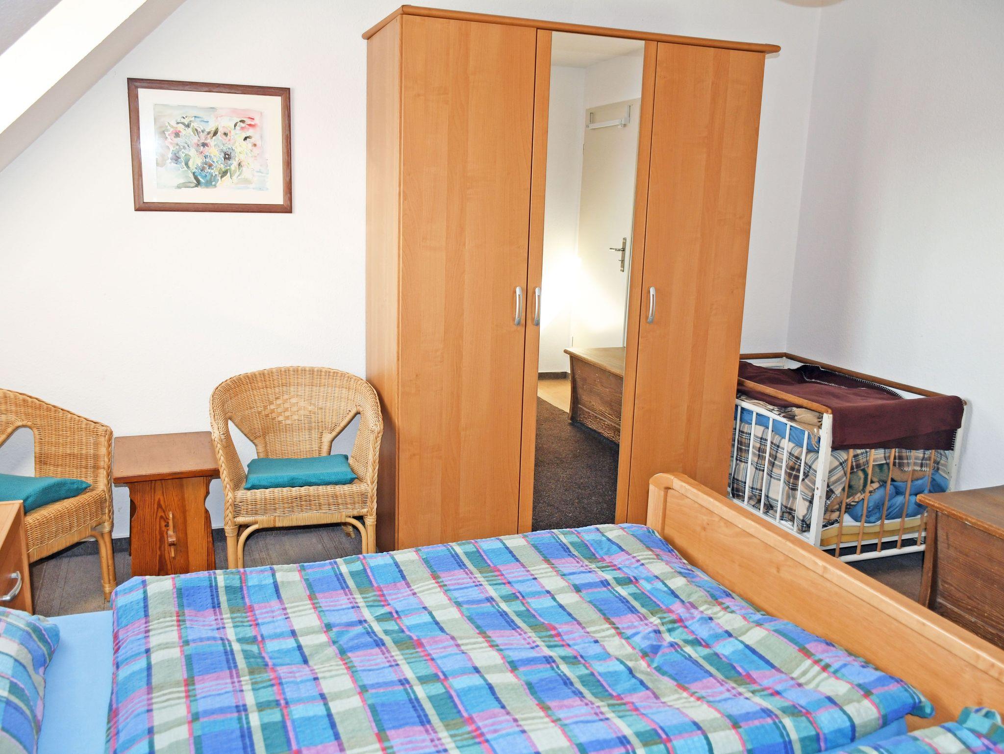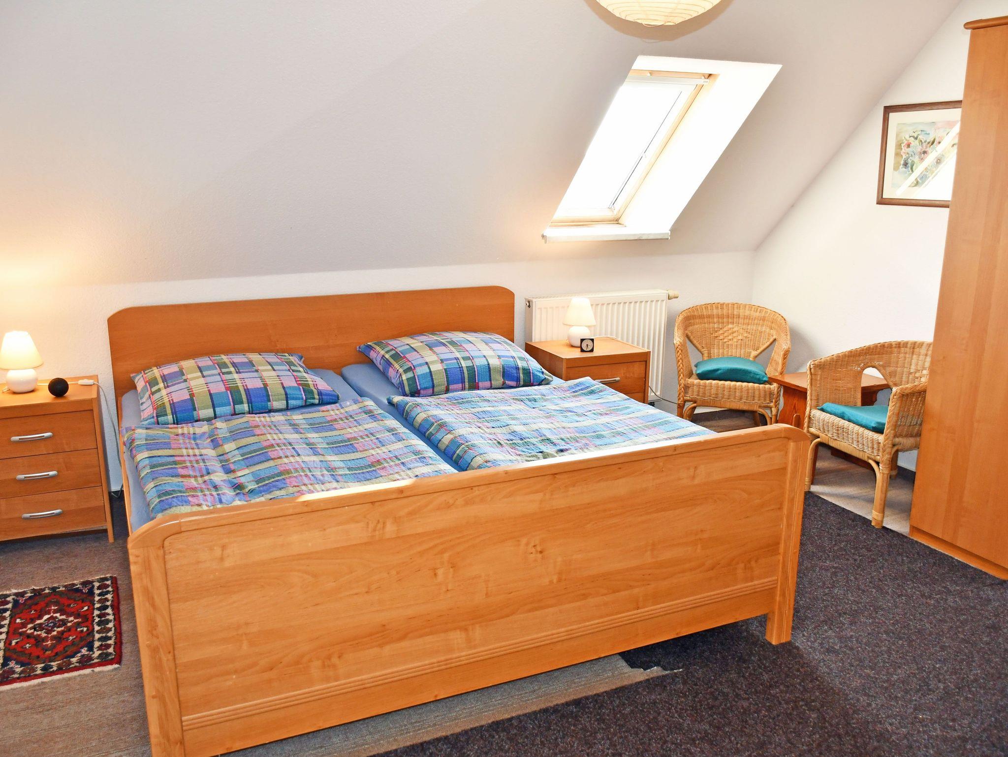 Im Wohnraum befinden sich eine bequeme Couch mit Tisch und ein TV-Gerät. Hier steht auch ein Esstisch mit Sitzgelegenheiten. Aus dem Fenster genießen Sie einen wunderschönen Ausblick zur Goor (Waldgebiet) und die Vilmnitzer Weiden.