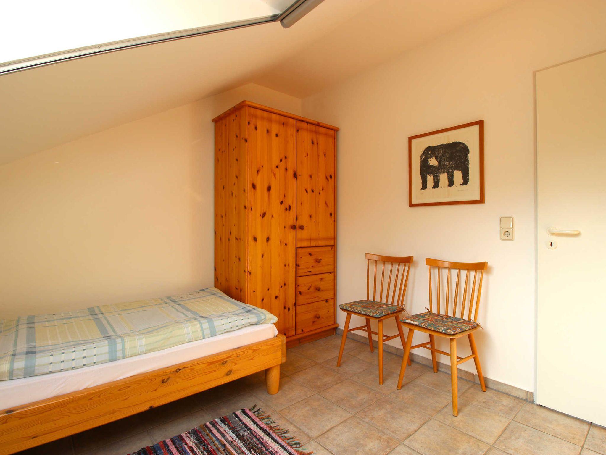 Im ebenfalls hellen, freundlichen Obergeschoss gibt es zwei Schlafräume. Diese sind jeweils mit zwei Betten (vier Betten pro Ferienwohnung) ausgestattet. Ein Schlafraum ist ein Durchgangszimmer (zur Treppe offen - siehe Grundriss). Beide Räume verfügen über große Dachfenster, die abgedunkelt werden können.