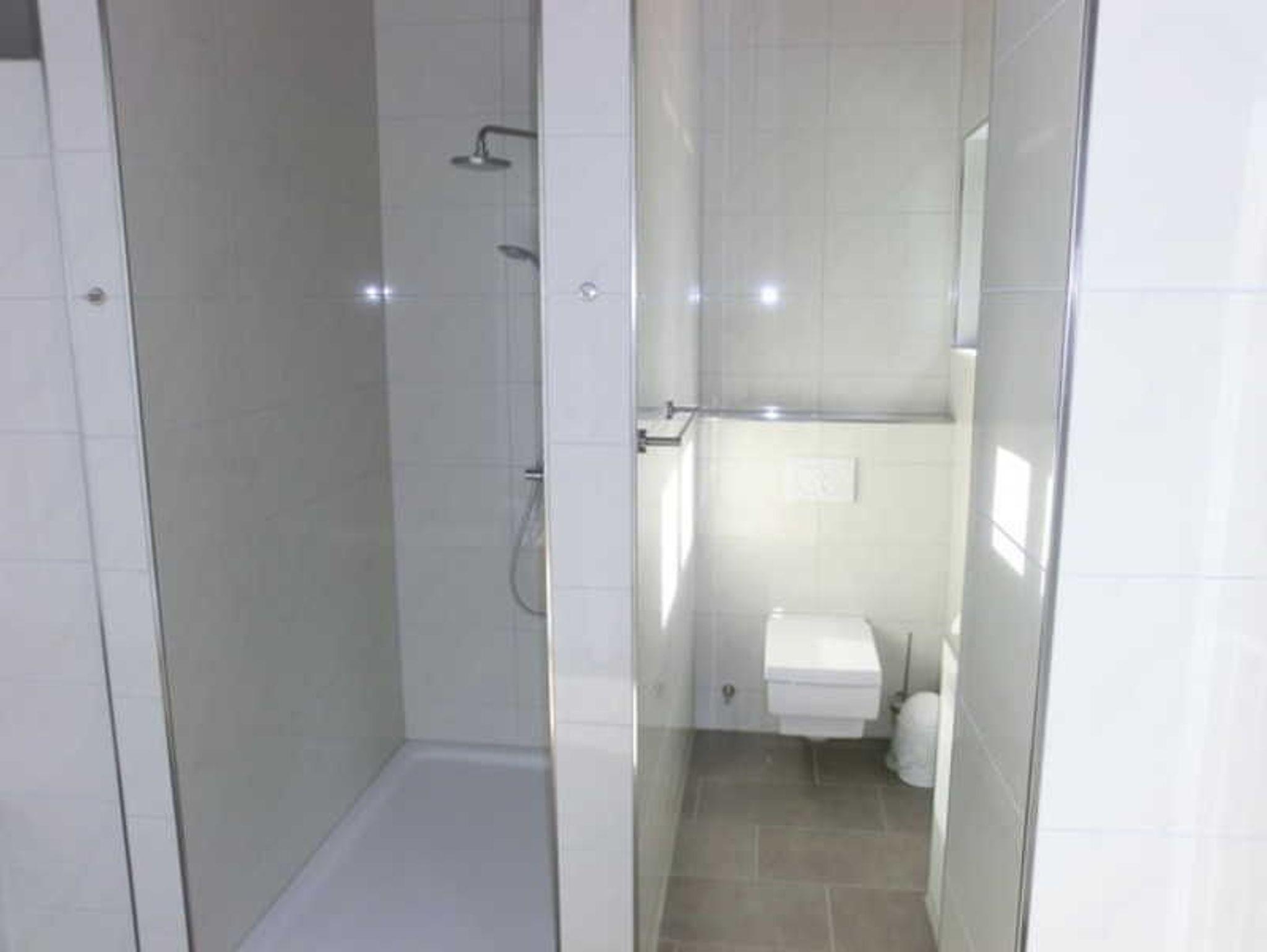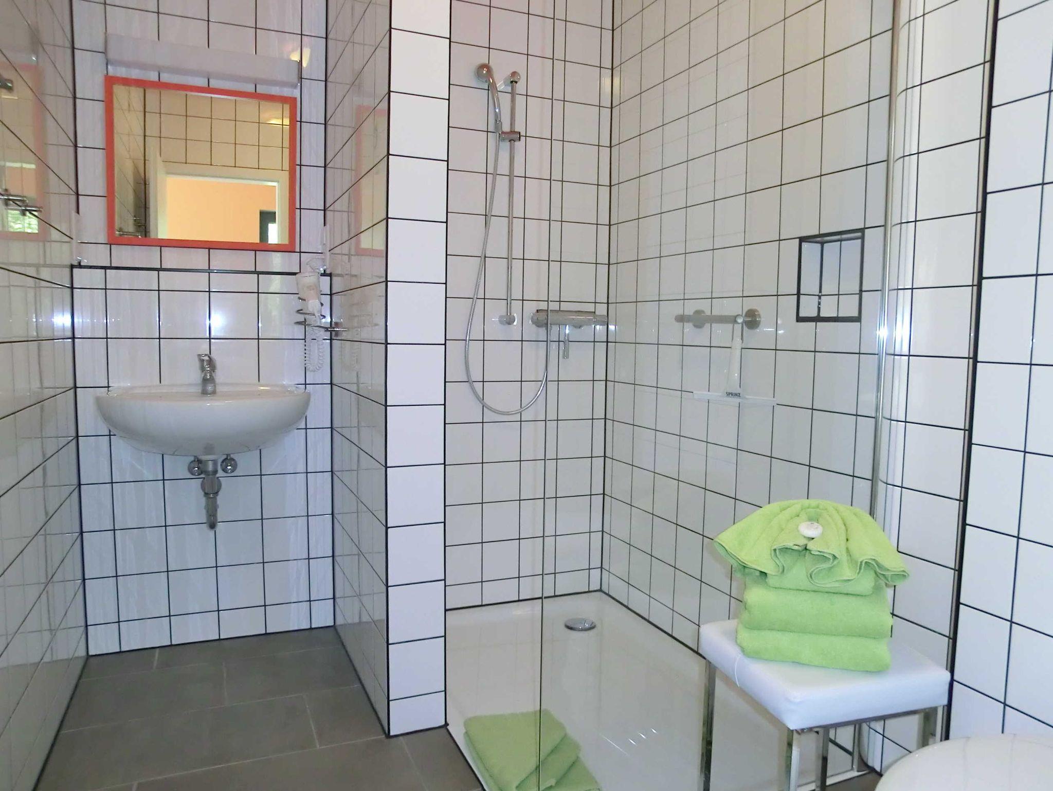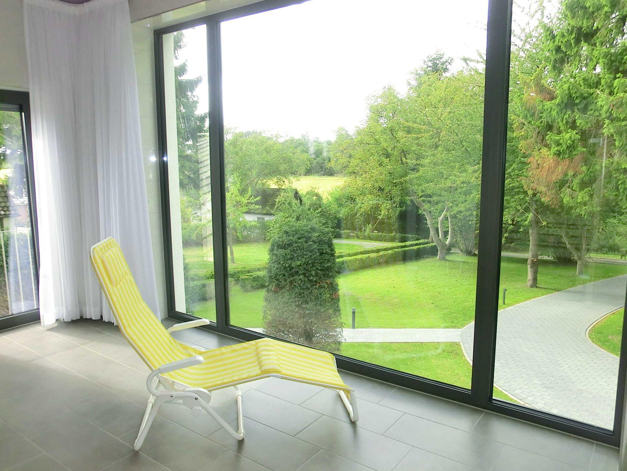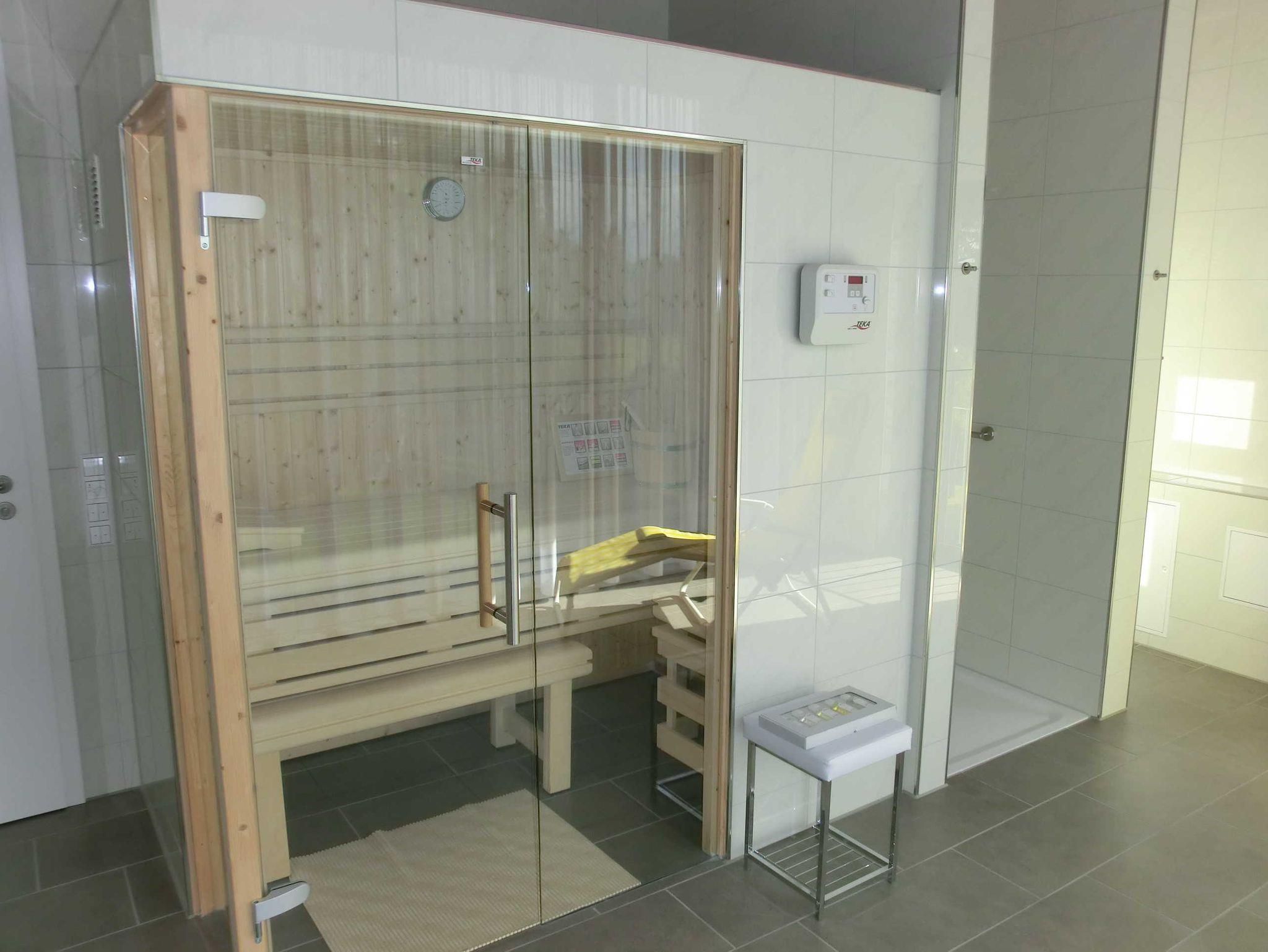 Ein weiteres Highlight dieser Wohnung ist das obige Bad mit Sauna und Panoramablick in den Garten: ebenerdige Dusche (90x140), WC, großes Waschbecken mit Ablage, Fön , beleuchteter Kosmetikspiegel, integrierte Sauna für 2 Personen und Relaxliege.