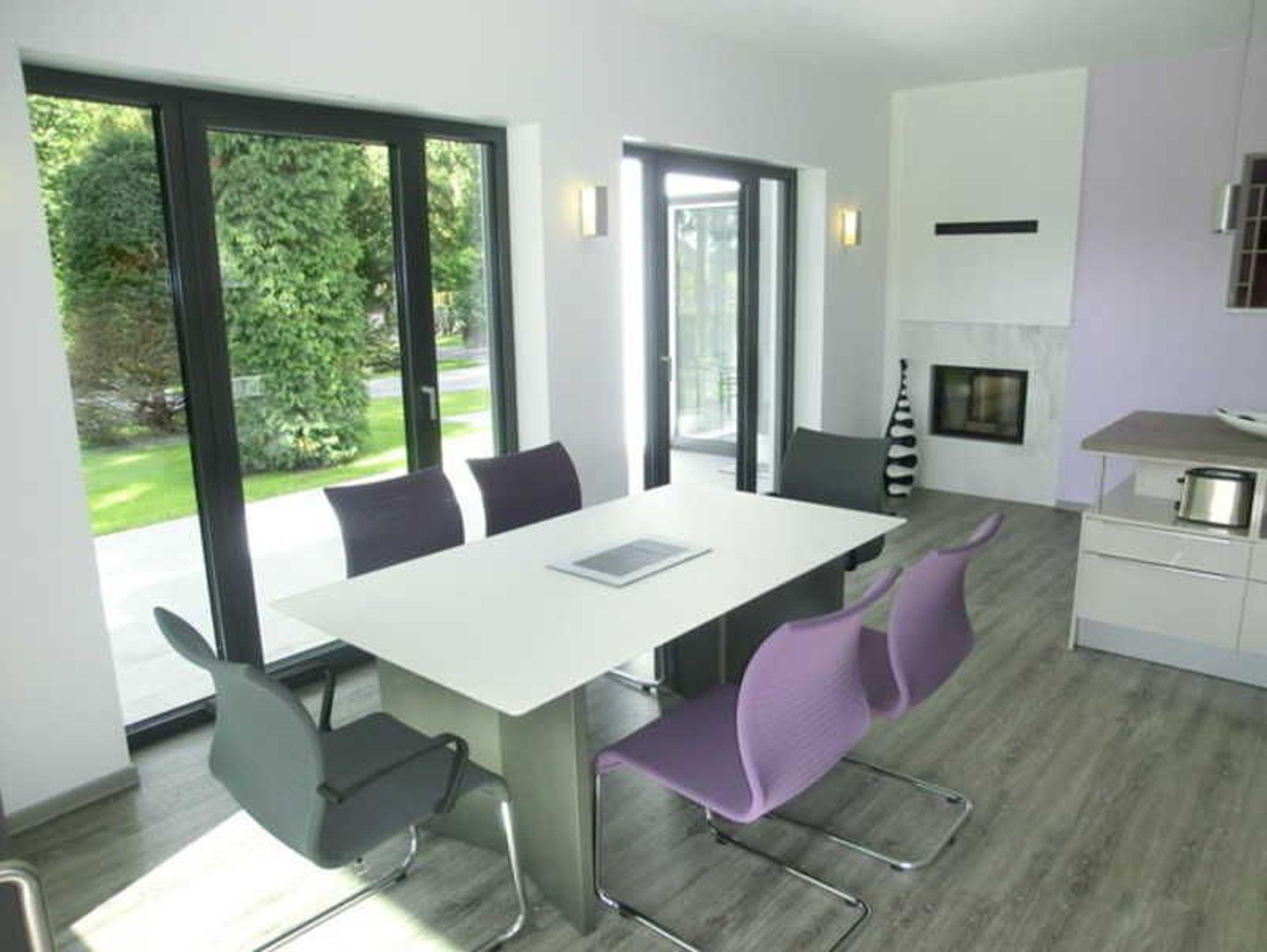 Einen zweiseitiger Kamin zwischen Küche und Wohnbereich sowie den Panoramablick in den Garten bietet Ihnen diese Luxuswohnung.