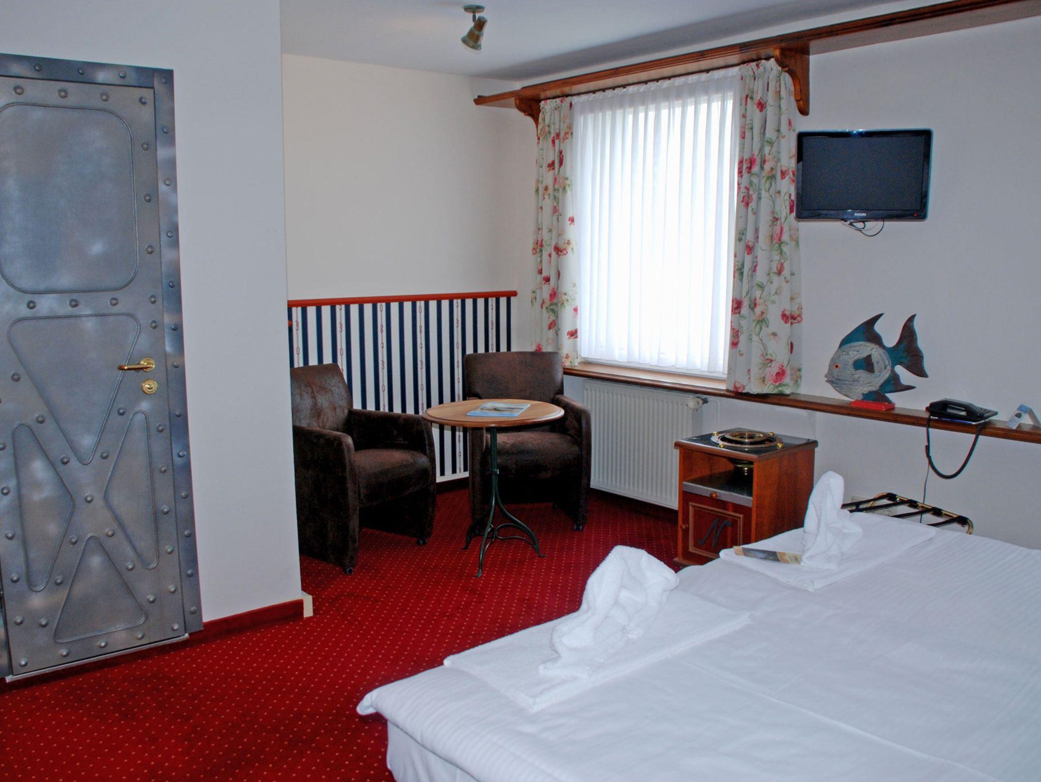 Alle Zimmer sind maritim, passend zum Thema U- Boot, gestaltet. Während die Doppel- und Einzelzimmer im Haupthaus liegen, befinden sich die Kapitänssuiten in 2 separaten Gästehäusern und sind über die einzelnen Terrassentüren separat von außen zu begehen. Die Wohnzimmer im Paterre sind unter anderem mit TV, Telefon und Minibar ausgestattet. Ebenfalls im Paterre befindet sich das Bad mit Dusche und WC. Über eine Holztreppe geht es in den Schlafbereich. Jede Kapitänssuite verfügt über eine eigene Terrasse. Weitere Angaben finden Sie bei der Detailbeschreibung der Hotelzimmer.