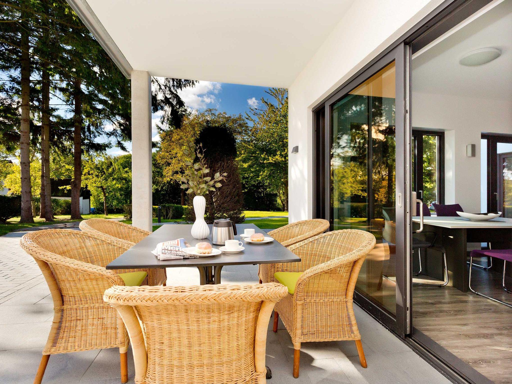Im Außenbereich wartet auf Sie eine Sonnenterrasse mit Tisch und Stühlen, einem großen Sonnenschirm und einem Elektrogrill.