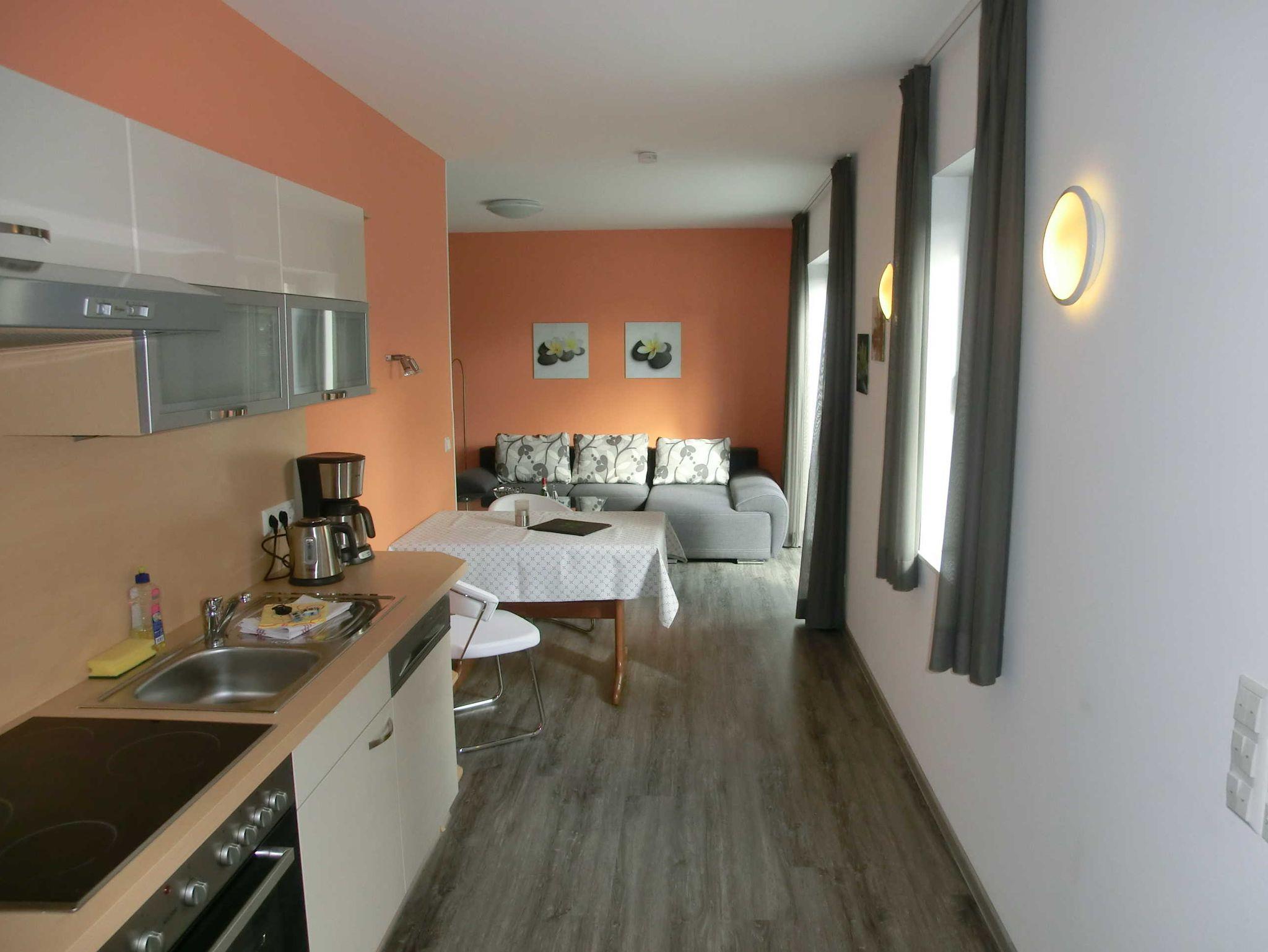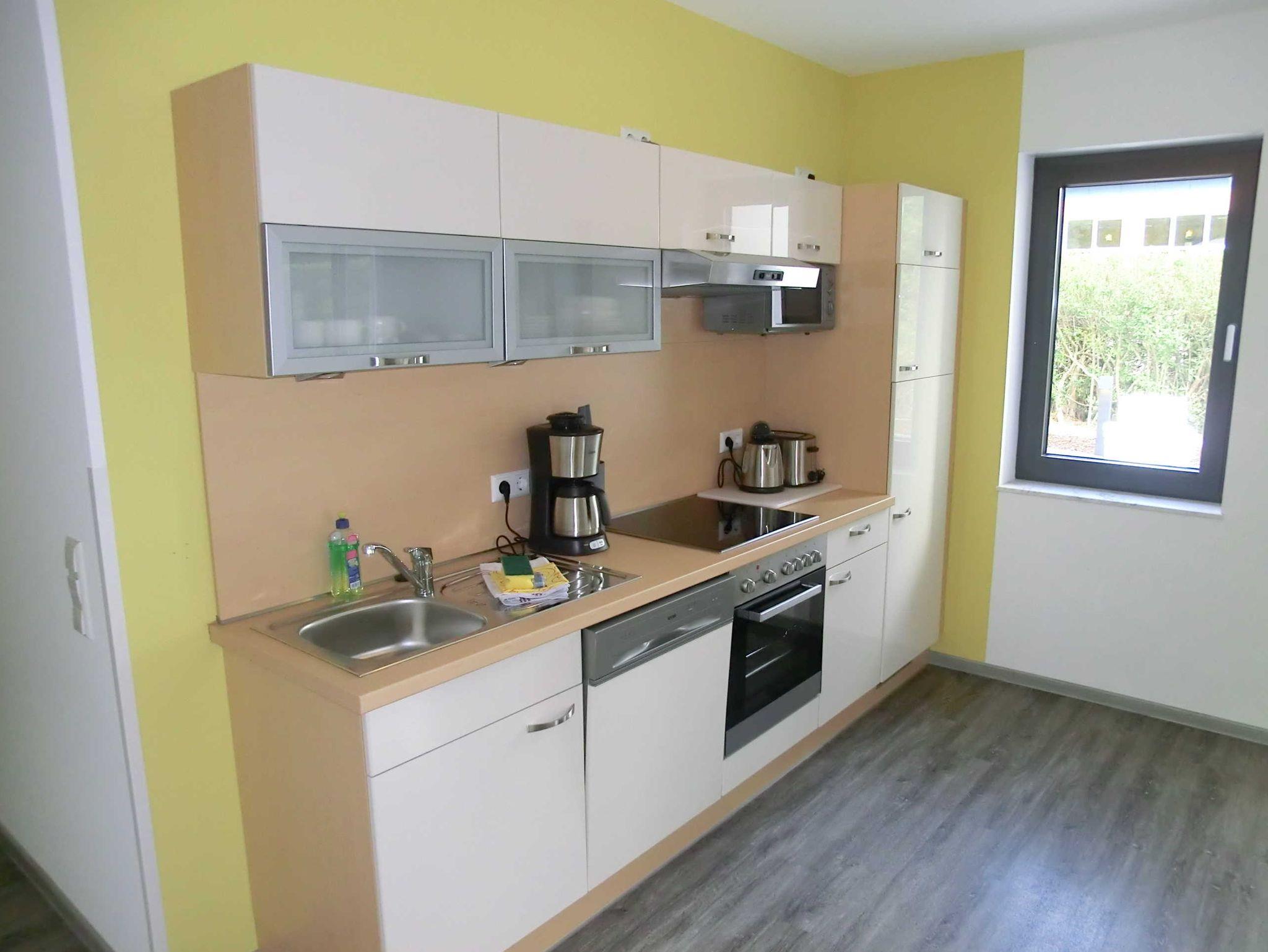 Sie besteht aus einem Wohn- Küchenbereich mit einer komplett ausgestatteten Küche: Herd mit Ceran-Kochfeld und Backofen, Mikrowelle und Kühlschrank mit TK-Fach, Spüle, Geschirrspüler, Kaffeemaschine, Toaster, Wasserkocher, Kochutensilien und Geschirr, Gläser und Bestecke.