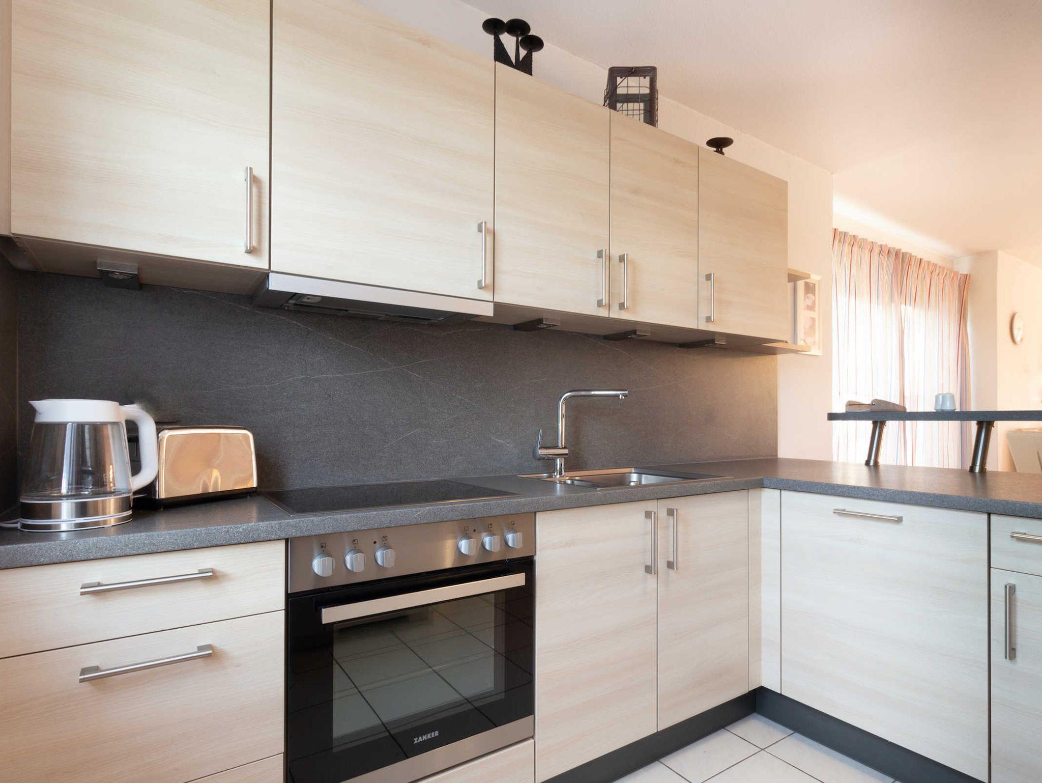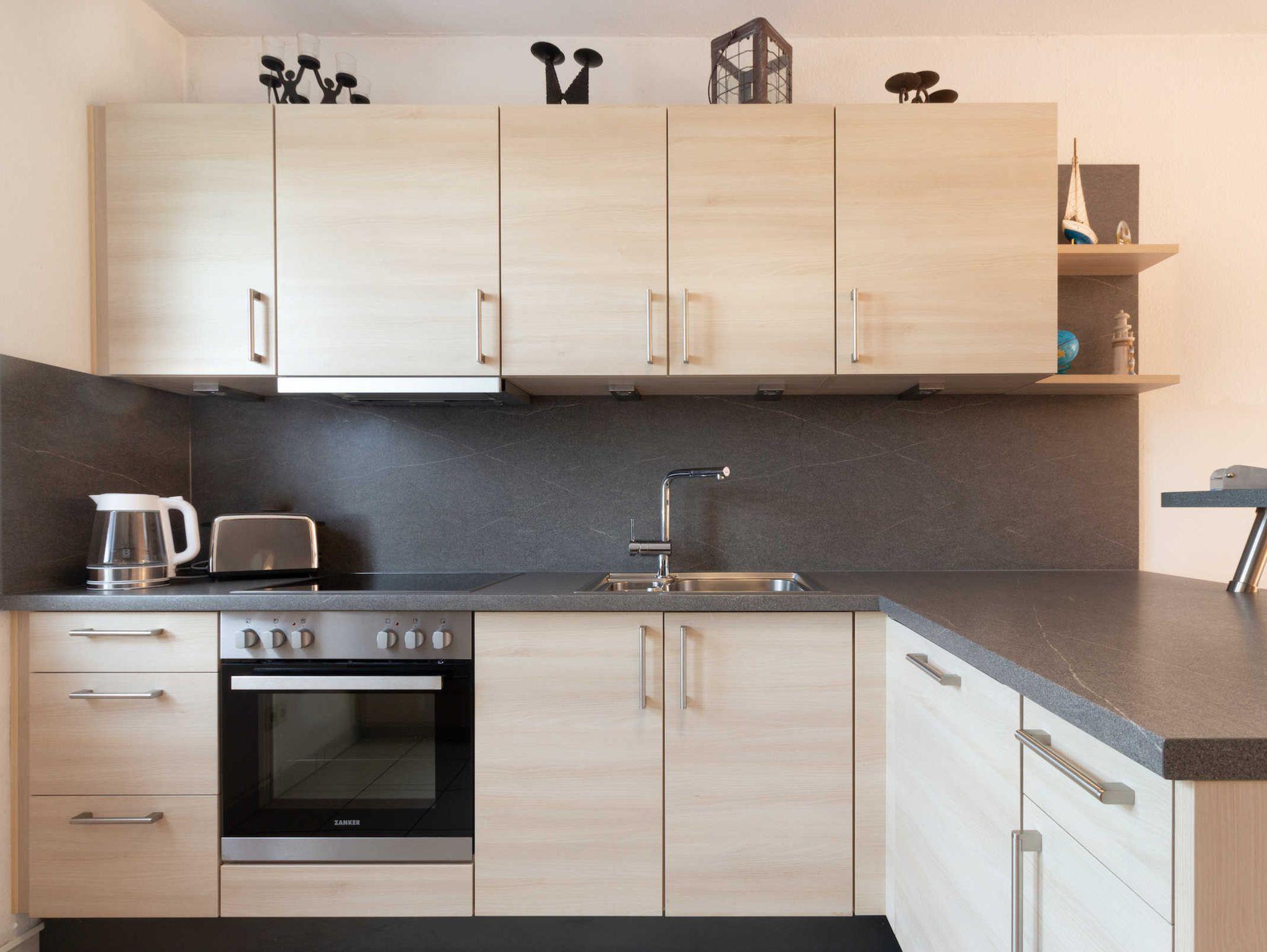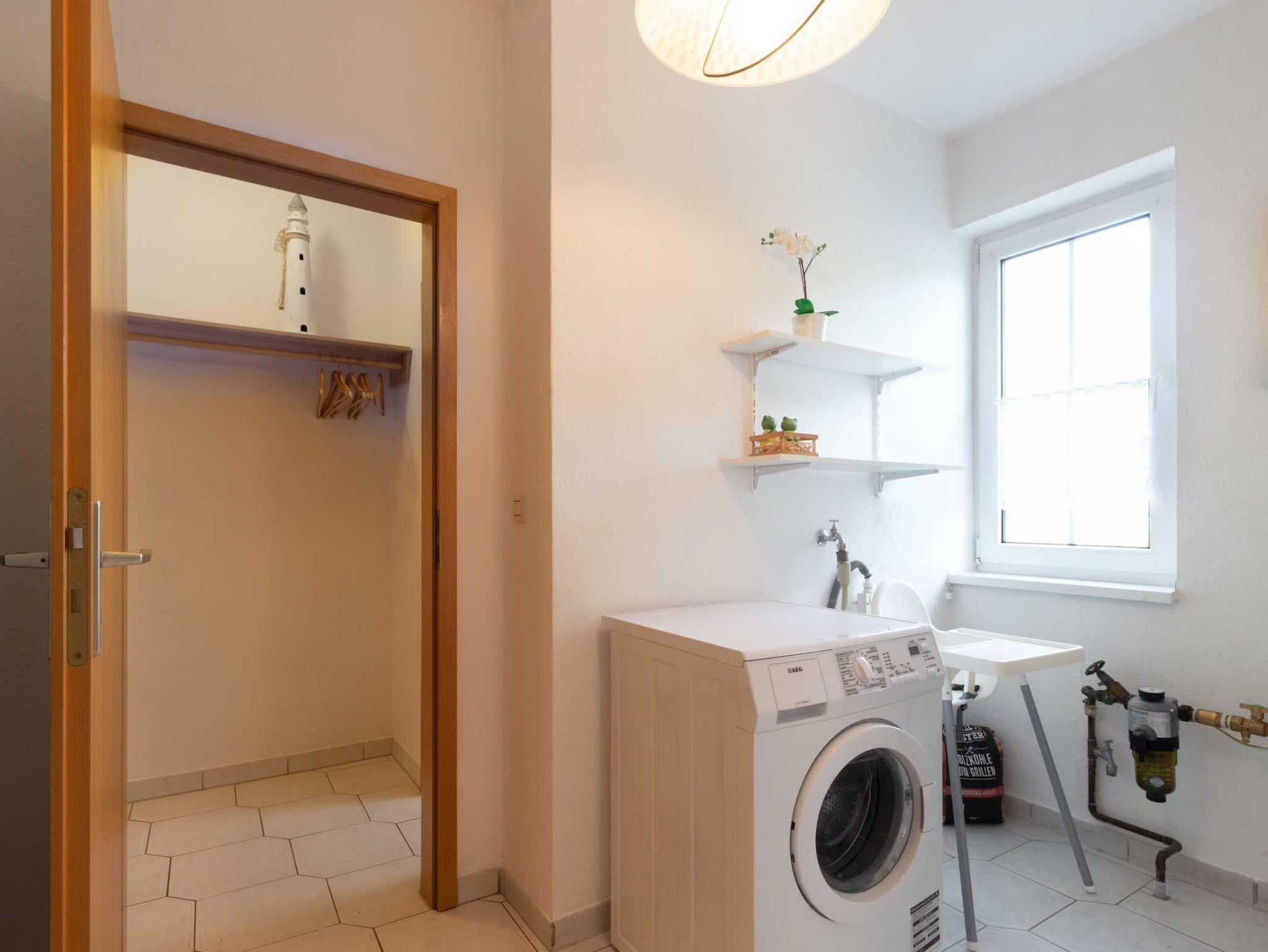 Die neue Küche ist komplett mit Kühlschrank (mit Eisfach), Mikrowelle, Geschirrspüler, Herd mit Ceranfeld und Backofen ausgestattet. Im Hauswirtschaftsraum befindet sich die Waschmaschine.