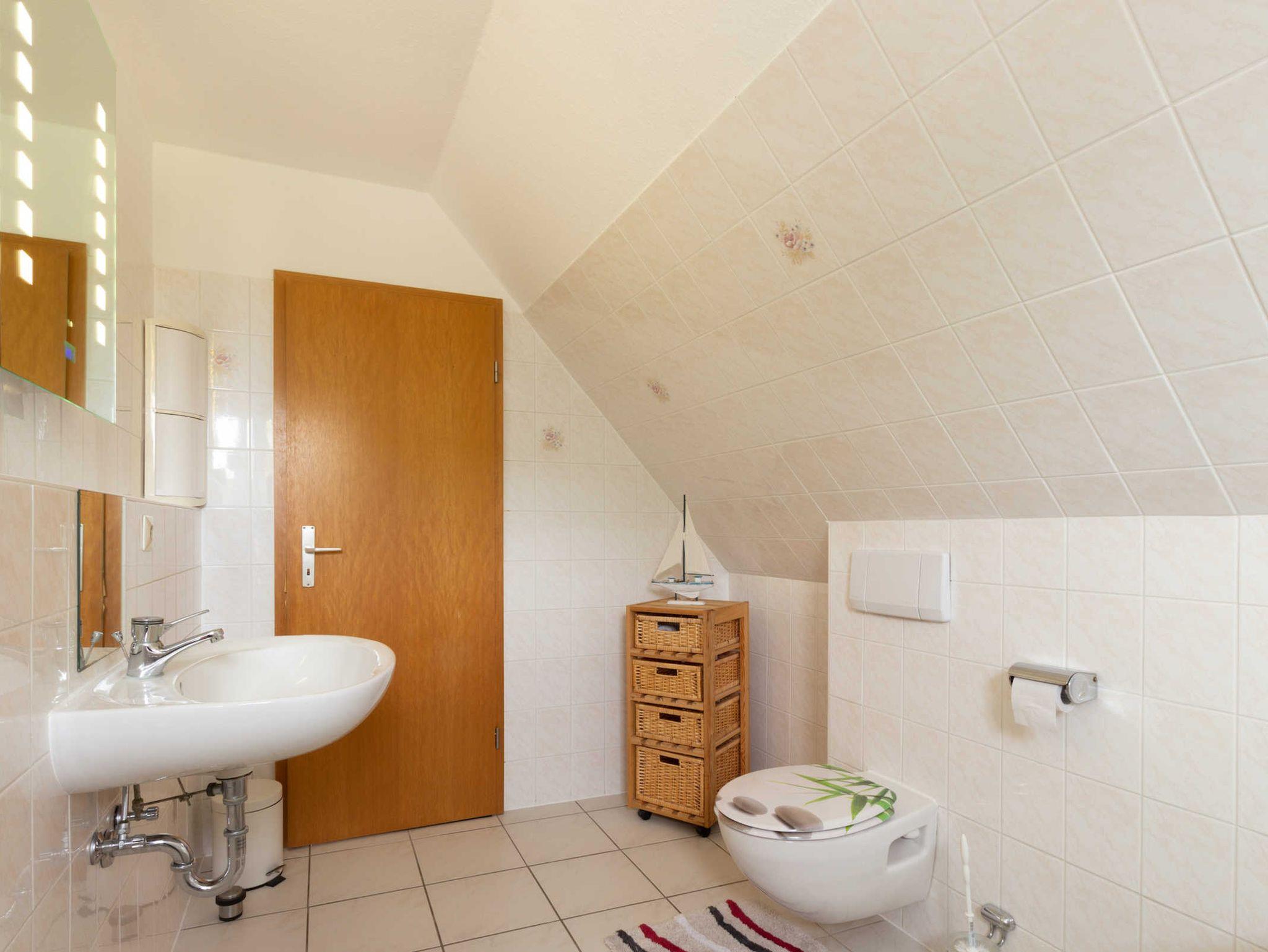 Oben stehen drei separate Schlafzimmer sowie ein Badezimmer mit Badewanne und WC zur Verfügung.