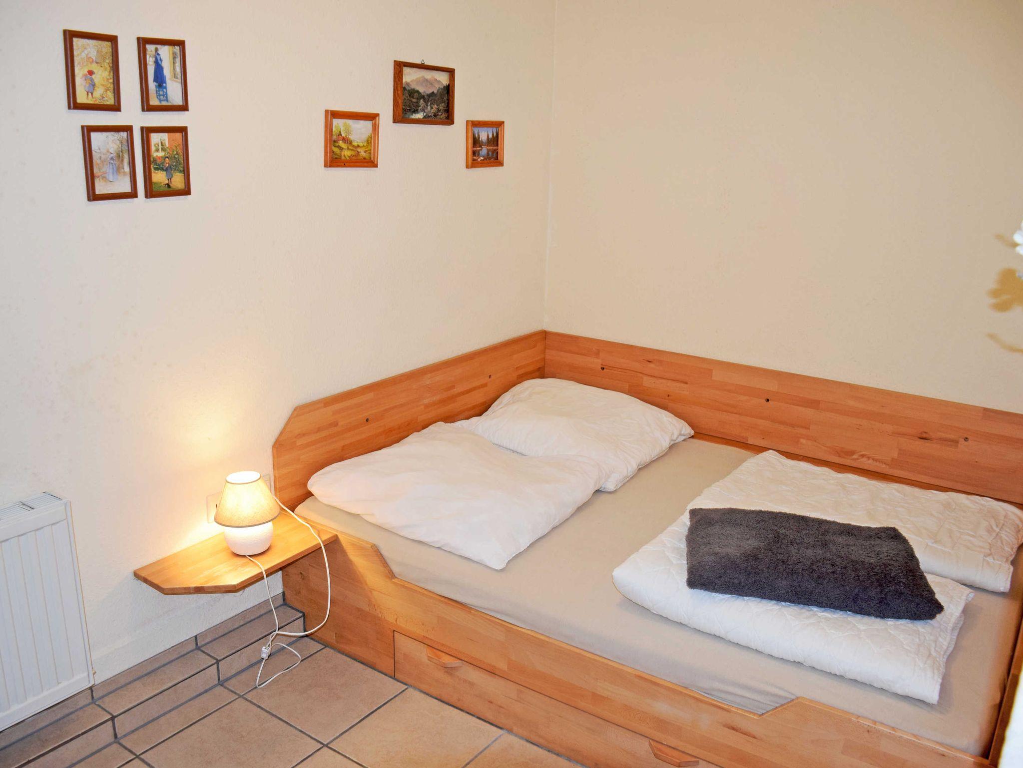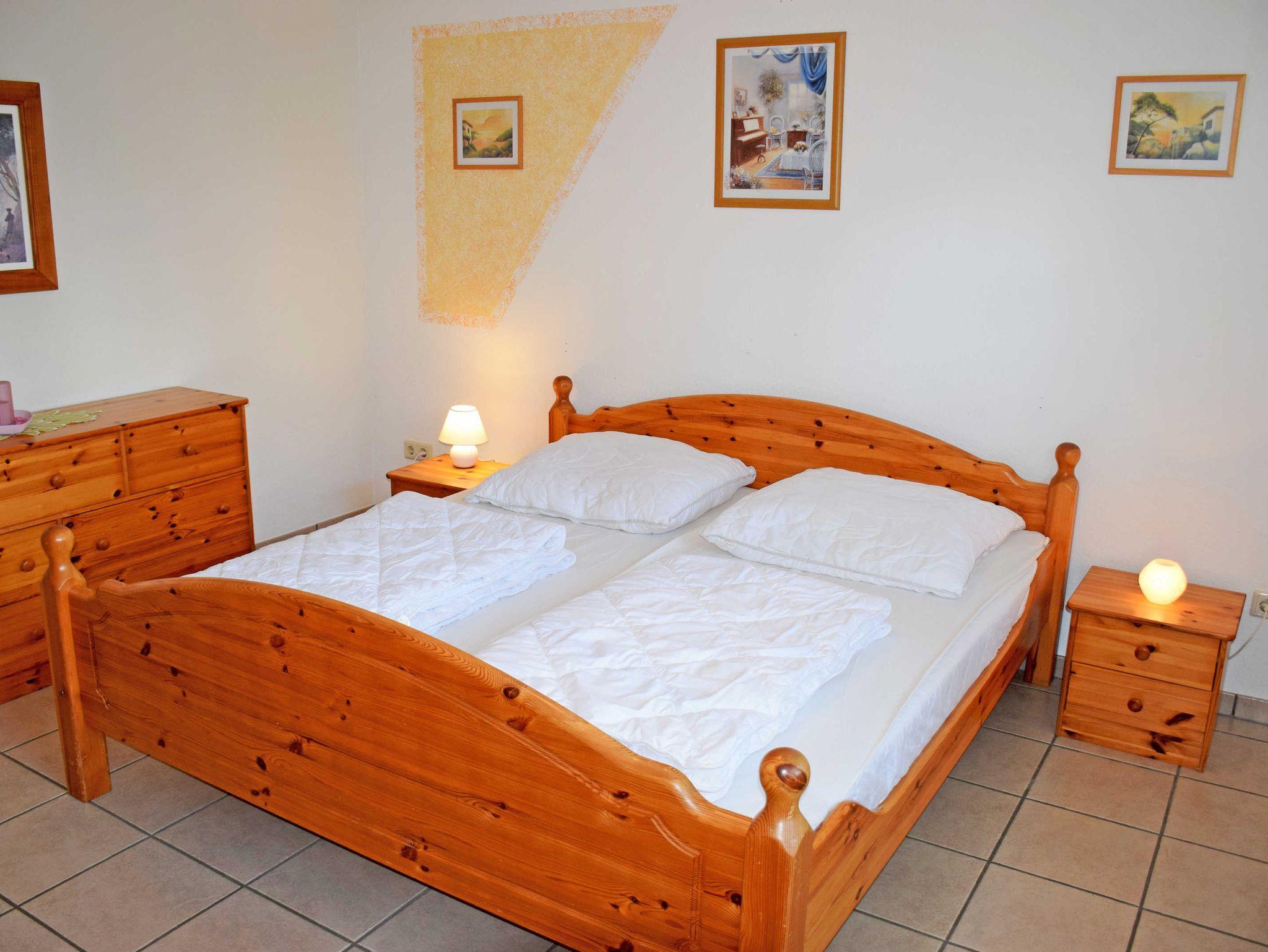 Im ersten Schlafzimmer stehen ein bequemes Doppelbett mit Nachttischen und Leselampen, sowie ein Kleiderschrank. Das zweite Schlafzimmer bietet ebenfalls ein Doppelbett an. Hinter dem Haus gibt es für diese Ferienwohnung einen großen Hofgarten mit Terrasse und Gartenmöbeln, wo man frühstücken oder abends grillen kann.