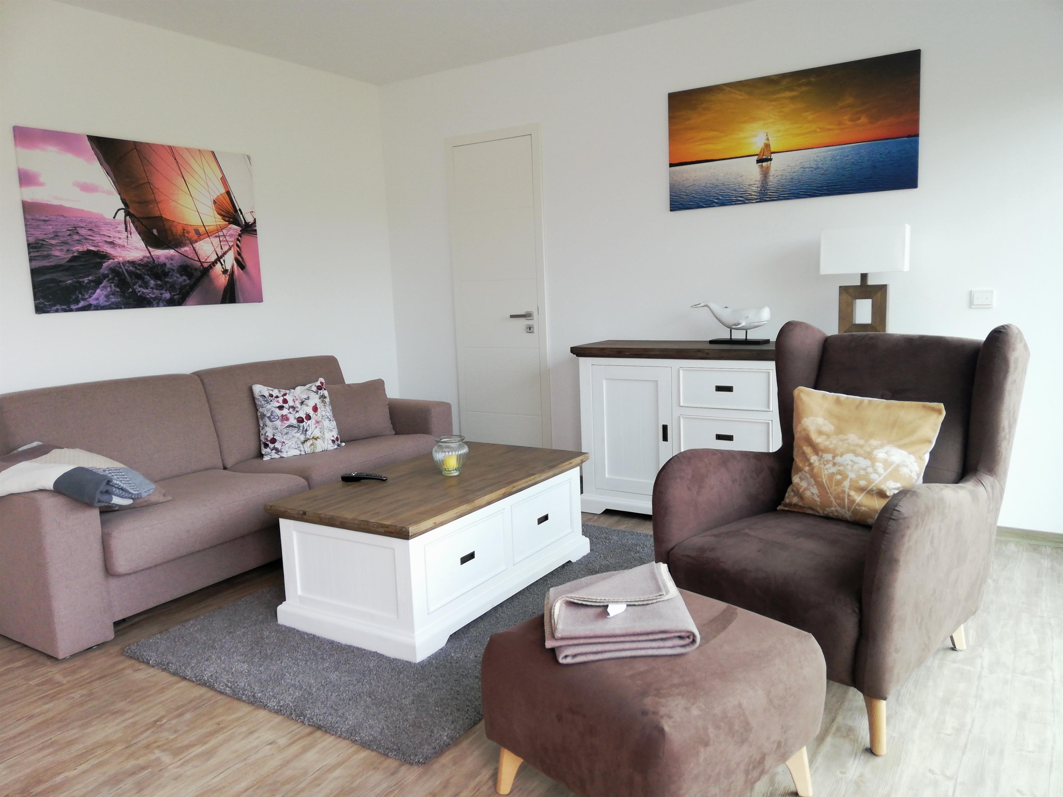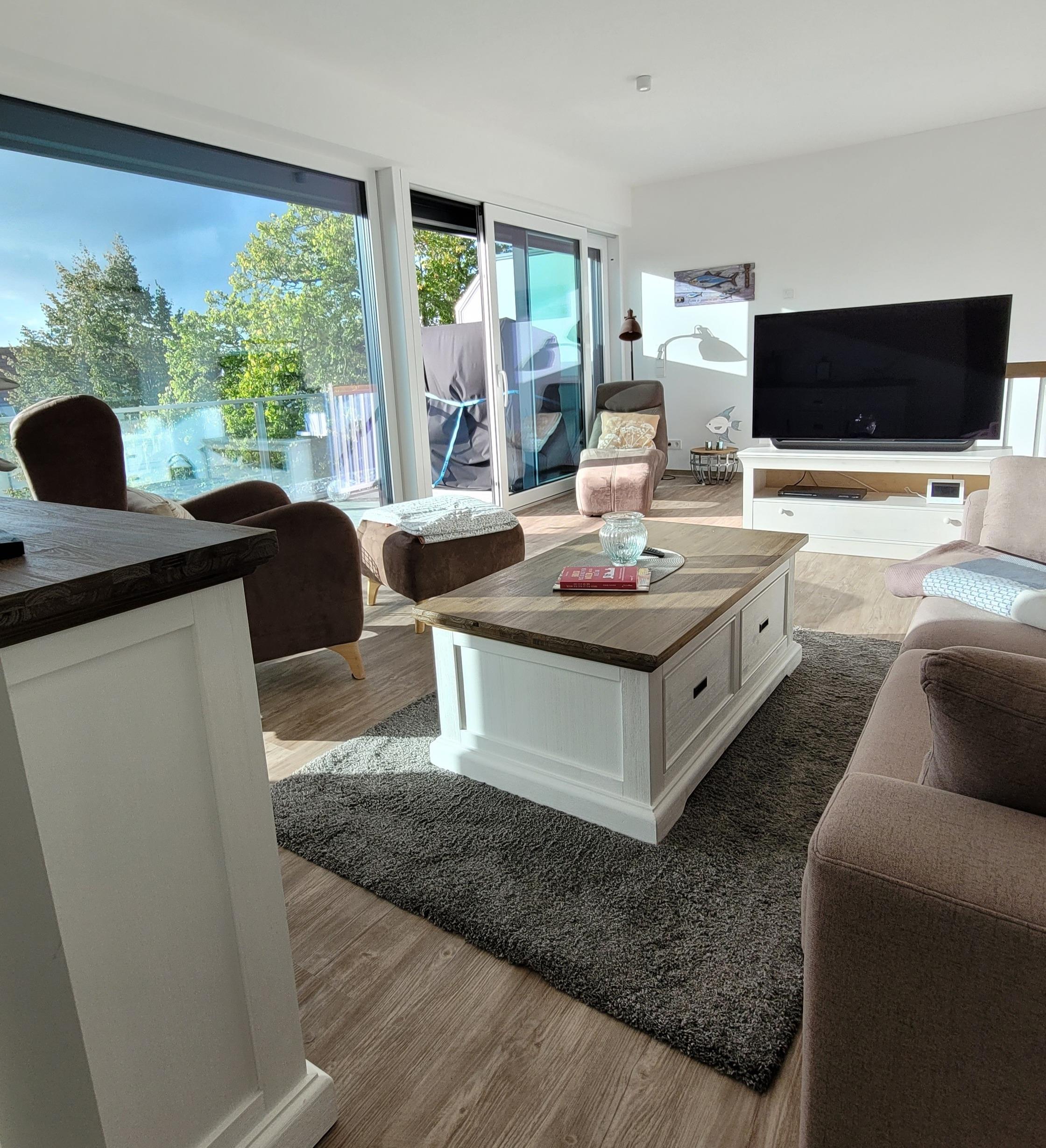 Im Wohnbereich im Obergeschoss erwartet Sie ein gemütliches Sofa (mit Schlaffunktion und Lattenrost), zwei bequeme Lesesessel und ein großer Flachbildfernseher – das Highlight aber ist das Panoramafenster, das Ihnen einen herrlichen Blick auf die Umgebung und den Hafen eröffnet.