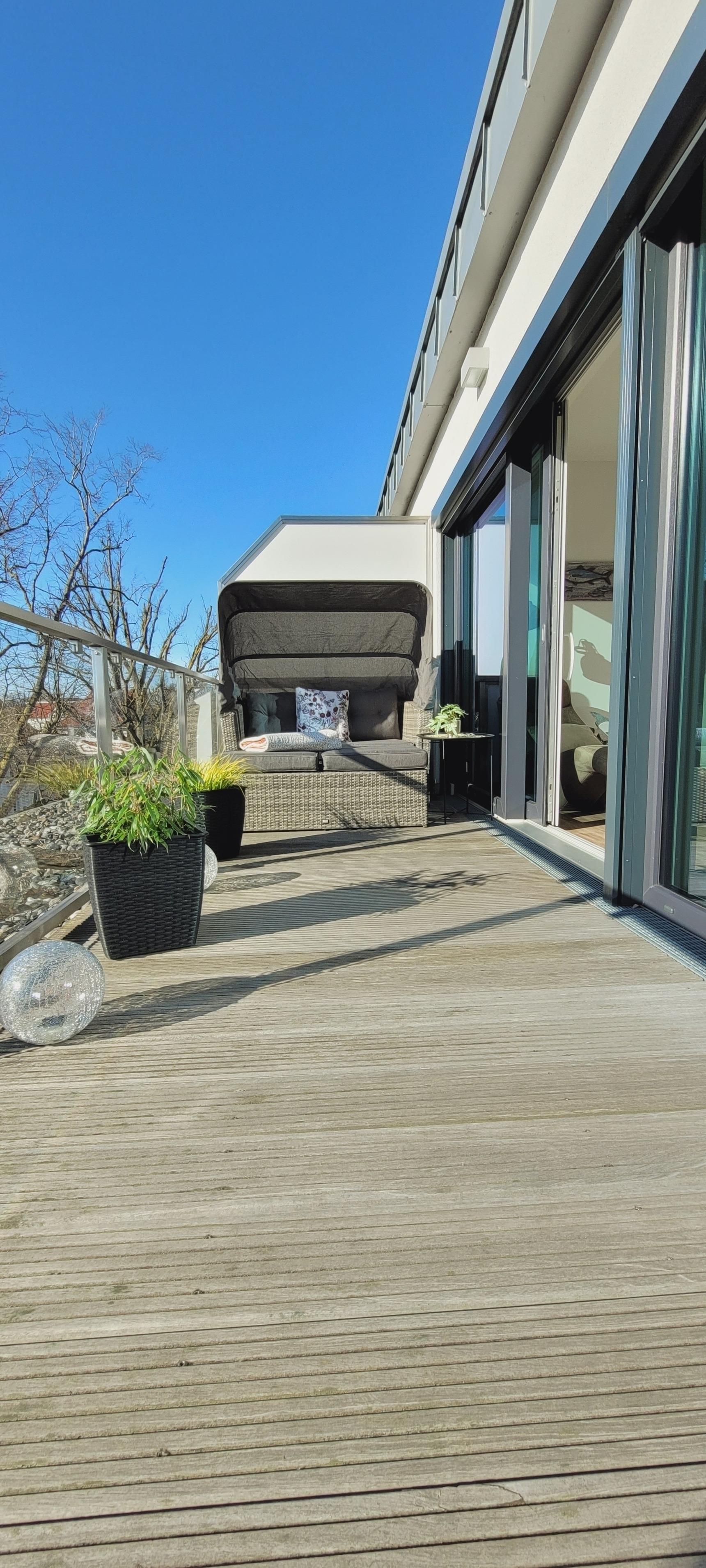 Von hier aus gelangen Sie auf den Balkon, der Küche und Schlafzimmer verbindet. Auf der Dachterrasse können Sie im Liegestuhl oder in Ihrem Starndkorb entspannen.
