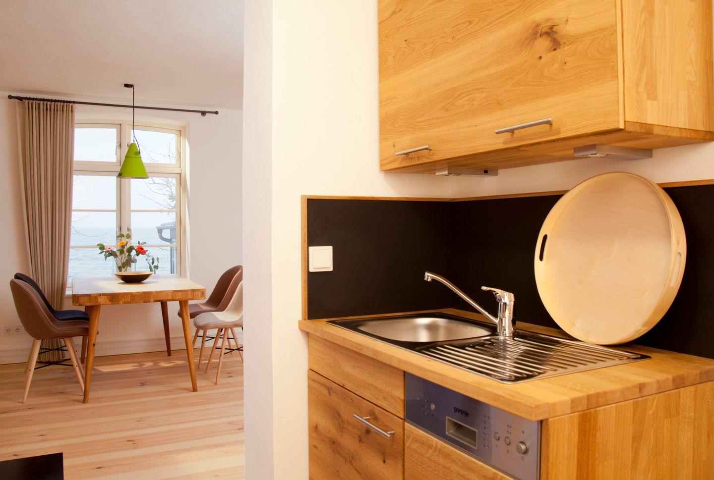Direkt von der Couch und dem angrenzenden Essbereich können Sie den traumhaften Wasserblick genießen. Die voll ausgestattete Küche bietet Ihnen einen Geschirrspüler, 2-Felder Ceranherd mit Backofen, Kühlschrank und viele weitere Küchenutensilien.