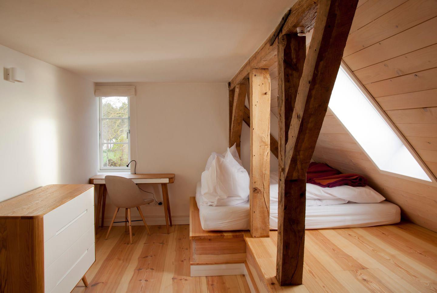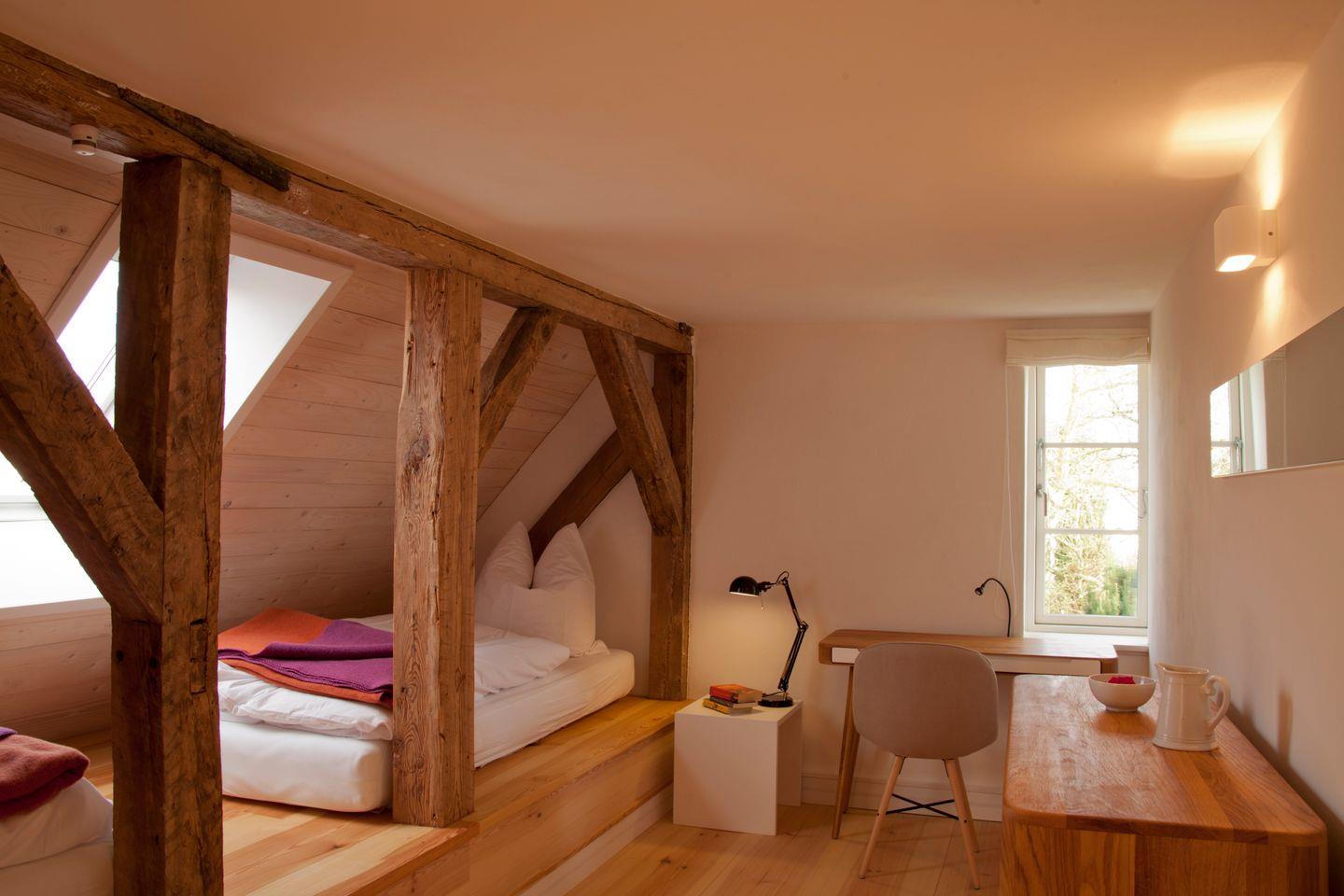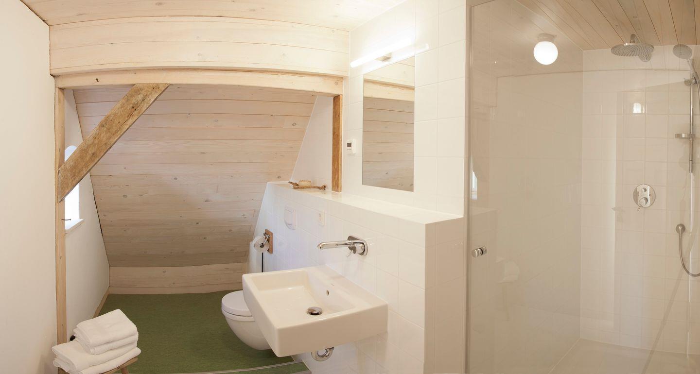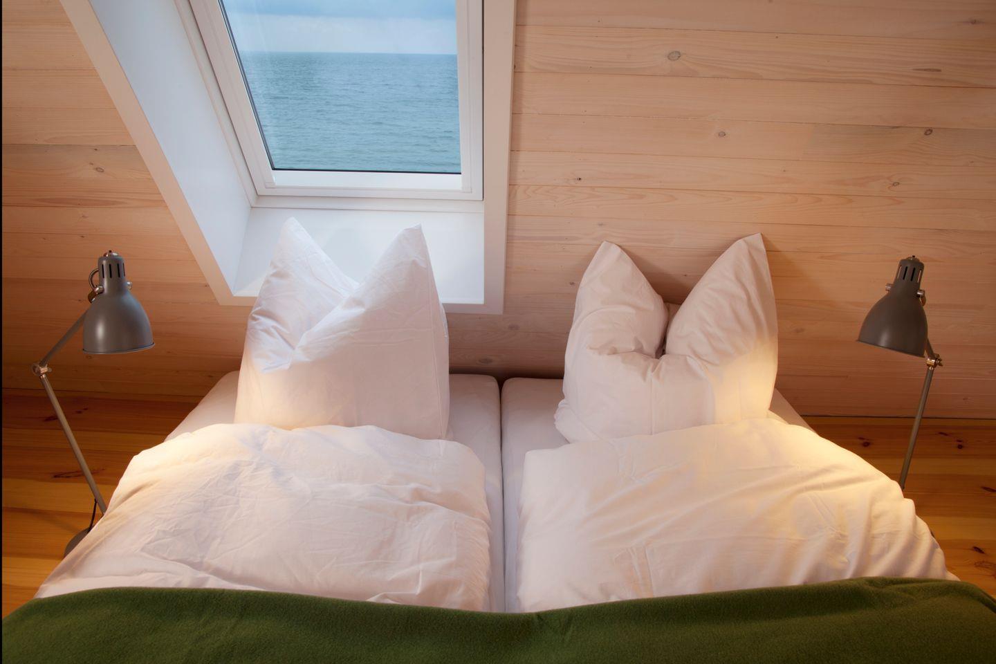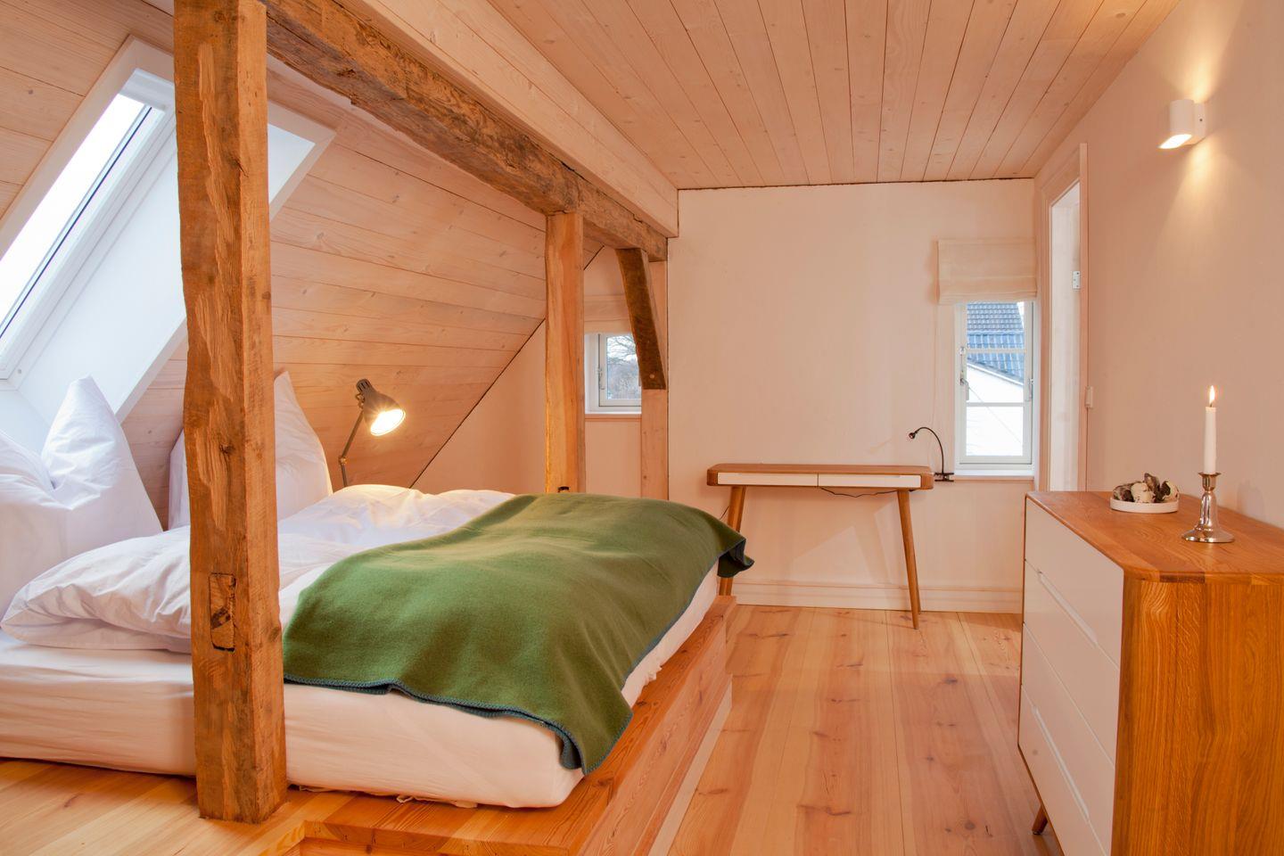 Die Wohnung verfügt über 3 Schlafzimmer, das Eine mit einem bequemen Doppelbett auf einem Schlafpodest, die Anderen mit ebenfalls auf einem Podest befindlichen Einzelmatratzen, die nach belieben zusammen geschoben werden können. sowie ein Tageslichtbad mit Dusche und WC. Auch ein kleines Gäste WC befindet sich in der Wohnung.
