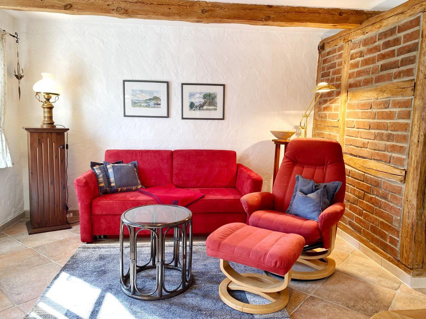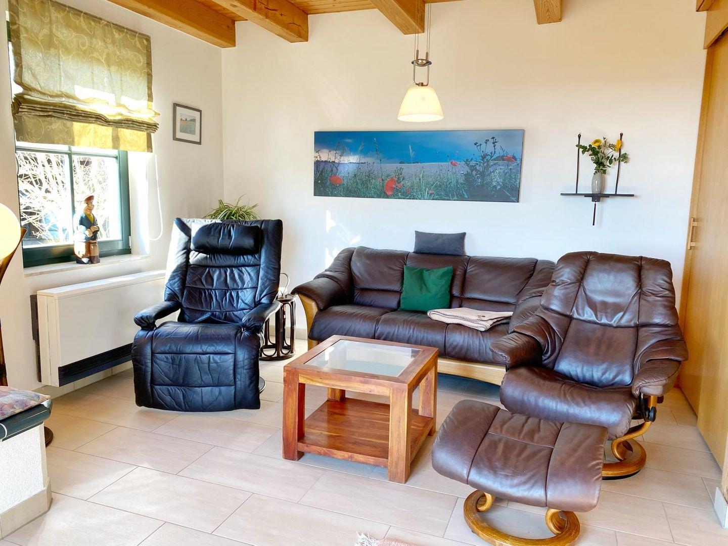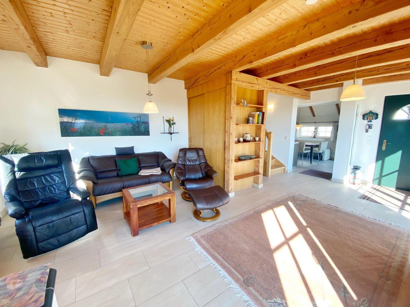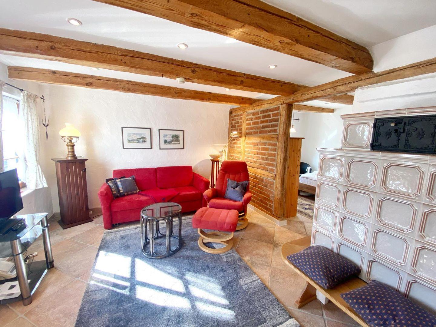 Auch hier gibt es im gemütlichen Wohnbereich mit Couchecke und Flachbild-TV einen Kachelofen mit Ofenbank.