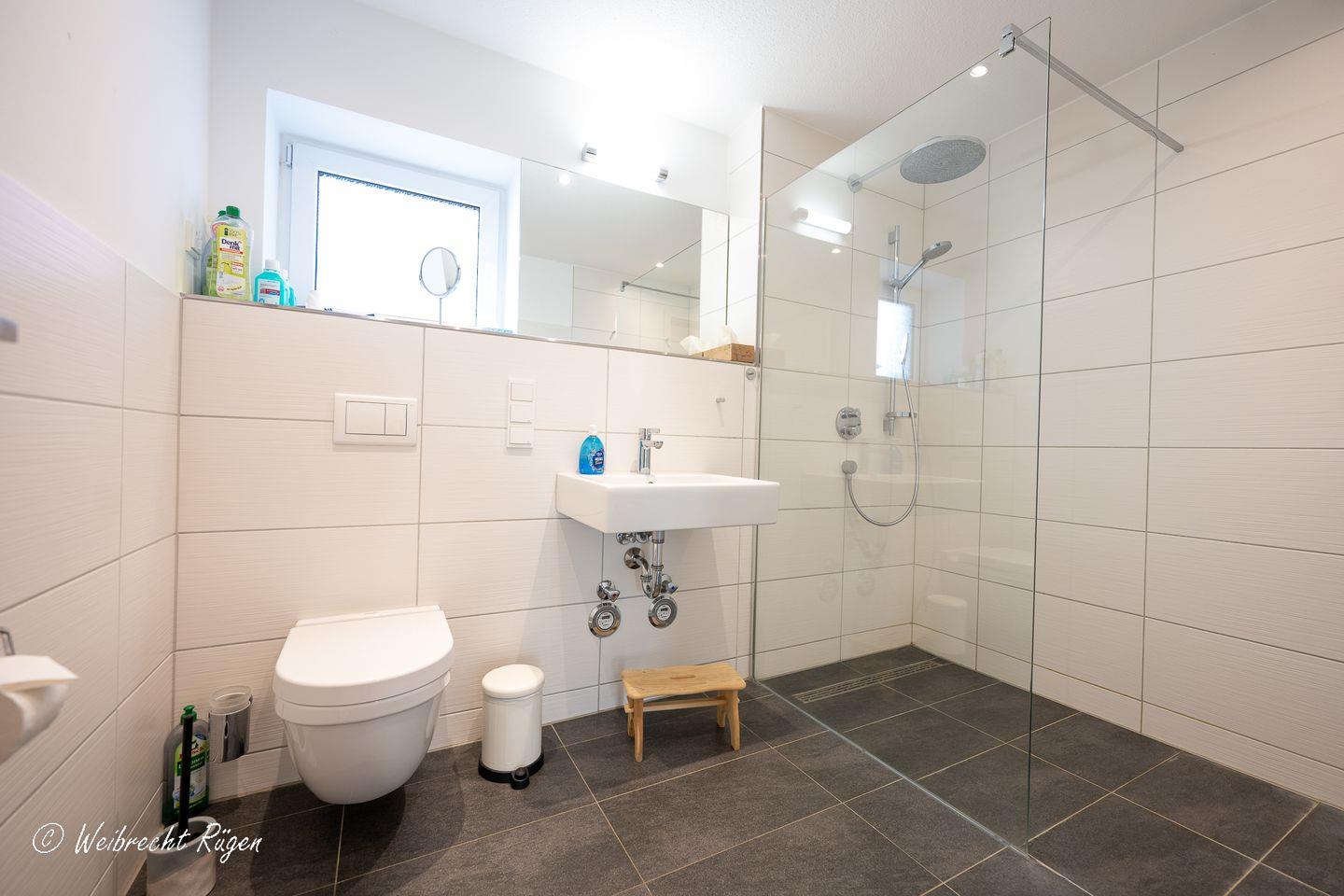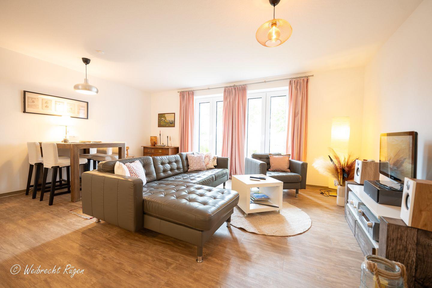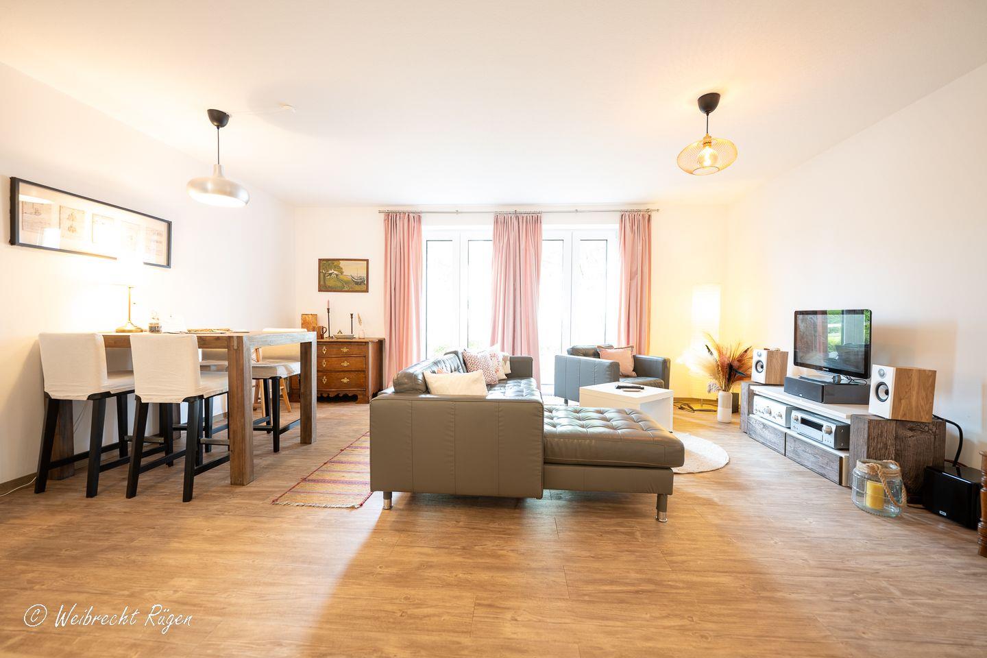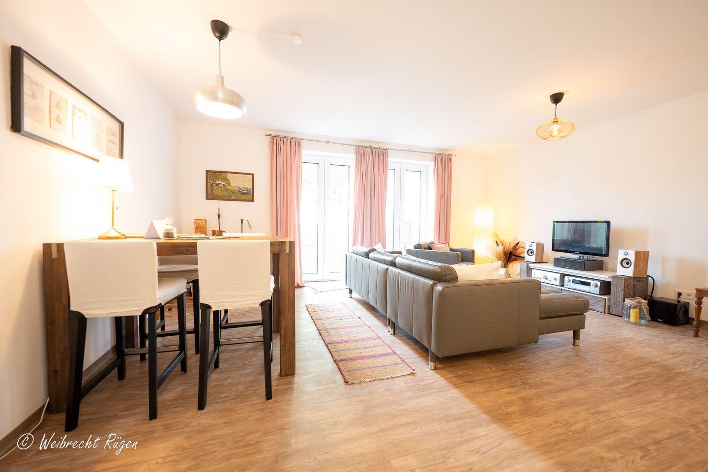 Das geräumige Wohn - und Esszimmer mit gemütlicher TV-Ecke und offener Küchennische bietet viel Platz zum Wohlfühlen. Die Wohnung verfügt über 2 Schlafzimmer, eines mit Doppelbett, eines mit einem 1,40 m breiten Bett. Das Tageslichtbad ist mit einer bodengleichen Dusche ausgestattet. Abgerundet wird die Ferienwohnung mit Terrasse und kleiner Rasenfläche in Westausrichtung.