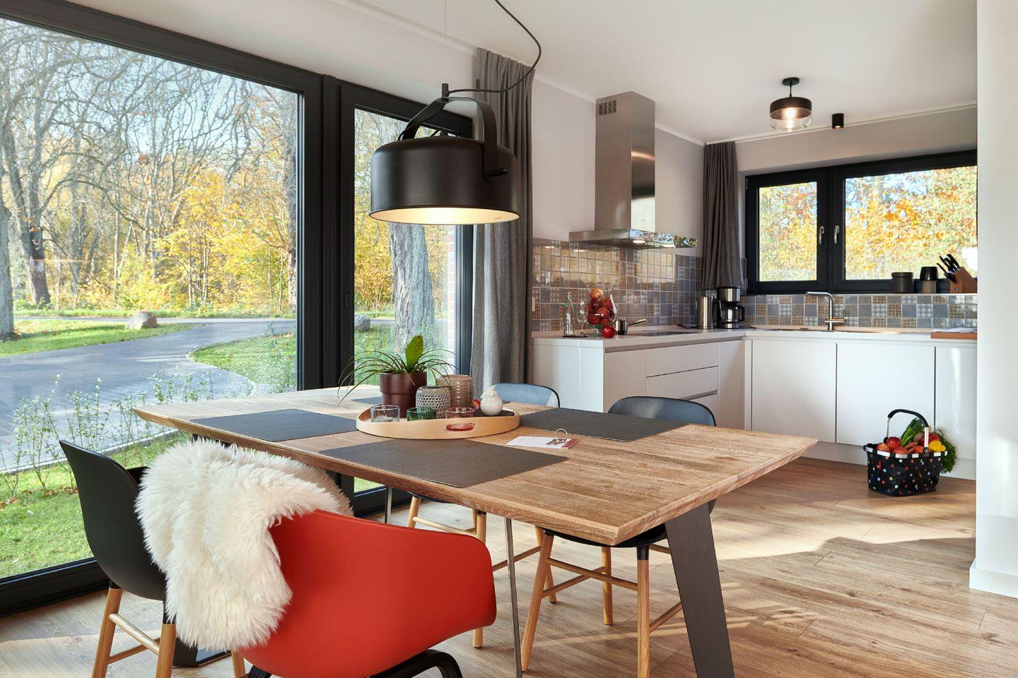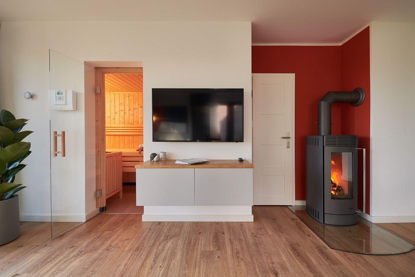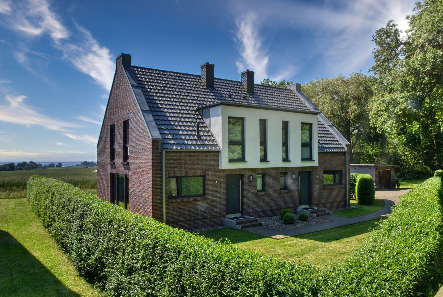 Klare Linien, eine typische Fassade, große Fensterflächen und eine stimmige Inneneinrichtung lassen keine Wünsche offen. In jeder Haushälfte stehen auf zwei Geschossen eine Wohnfläche von ca.100 qm zur Verfügung. Im Erdgeschoss gibt es ein Wohn-/Essbereich mit offener Küche, bestehend aus Küchenzeile und Küchenblock, sowie eine Sauna und ein Kamin. Großzügige Fensterfronten, die auf der Rückseite auf eine große zur Südseite hinausliegende Terrasse führen, bieten einen herrlichen Blick auf das Wasser. Im Erdgeschoss befinden sich ferner jeweils ein Gäste-WC und eine offene Garderobe. Im Obergeschoss, welches man über eine Eichenholztreppe erreicht, liegen jeweils zwei Schlafzimmer, ein Bad mit Badewanne und Dusche sowie eine Galerie mit Wasserblick. Die gesamte Wohnung ist mit einer Fußbodenheizung ausgestattet.