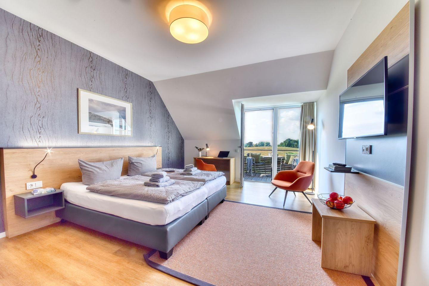 Wohnzimmer: Im gemütlichen Wohnzimmer erwartet Sie ein großzügiges Doppelbett, Hier können Sie nach einem erlebnisreichen Tag entspannen, TV schauen oder einfach den Blick in die Natur genießen.