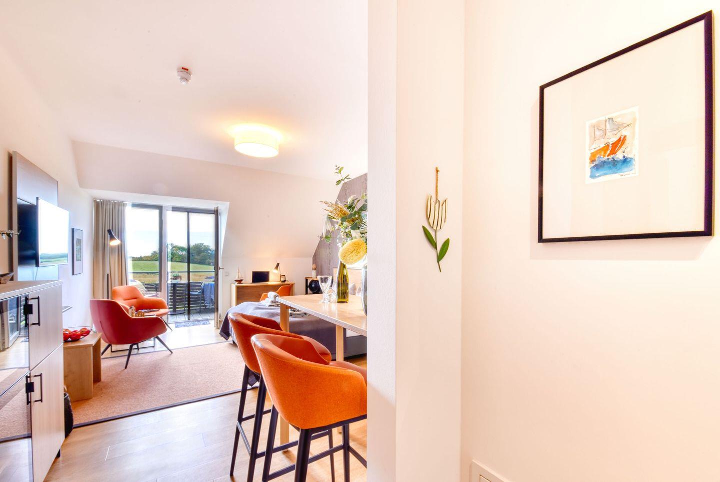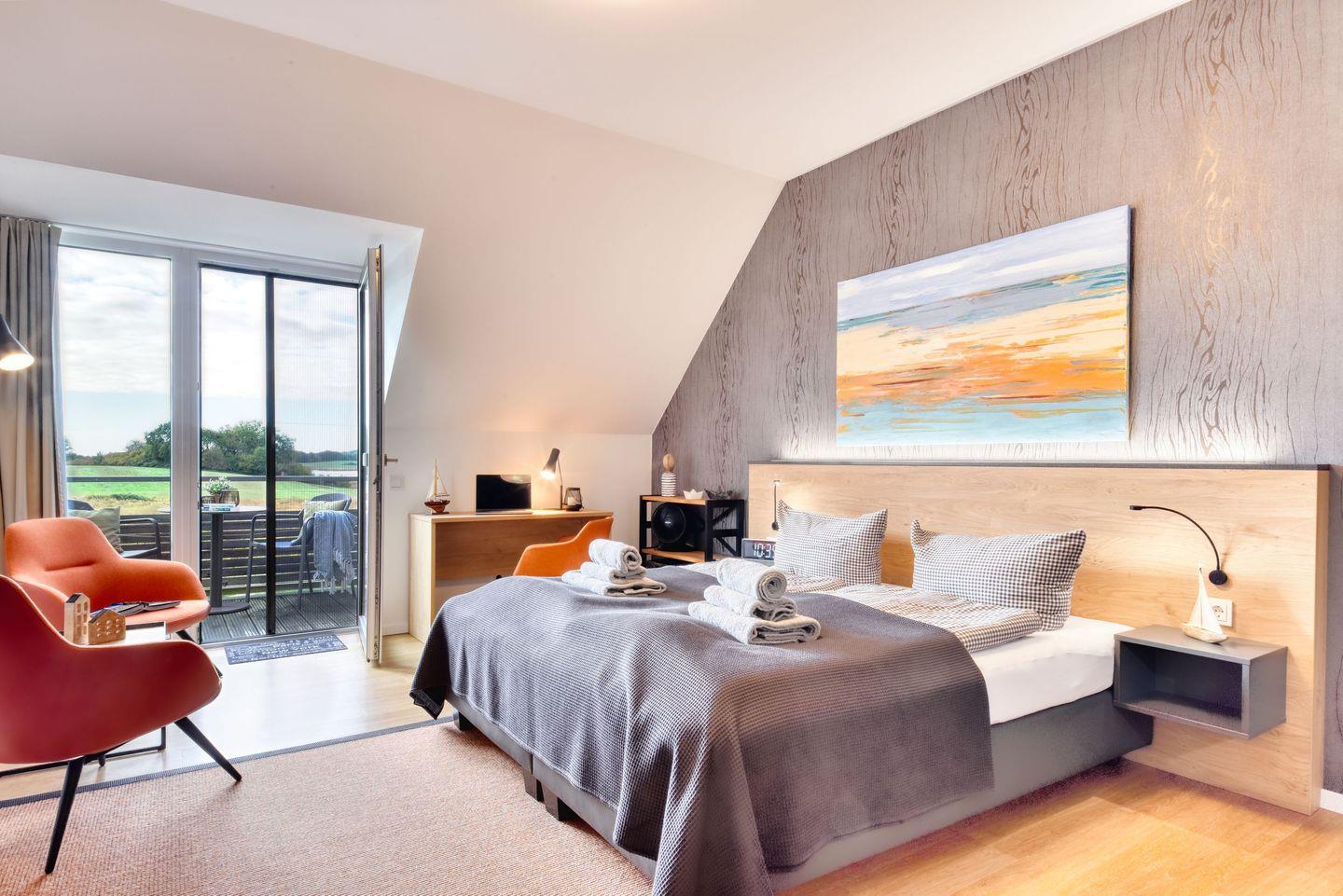 Wohnzimmer: Im gemütlichen Wohnzimmer erwartet Sie ein großzügigen Doppelbett, das Ihnen eine erholsame Nachtruhe garantiert. Hochwertige Bettwäsche und genügend Stauraum für Ihre Garderobe sorgen für zusätzlichen Komfort.. Hier können Sie nach einem erlebnisreichen Tag entspannen, TV schauen oder einfach den Blick in die Natur genießen.