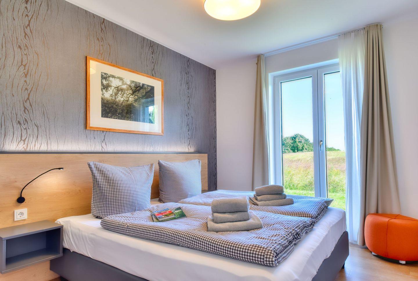 Das komfortable Schlafzimmer ist mit einem großzügigen Doppelbett ausgestattet, das Ihnen eine erholsame Nachtruhe garantiert. Die kleinen Bettschränkchen und Leselampen inklusive USB Lademöglichkeit statten Sie gut aus zum Lesen; egal ob analog oder digital. Hochwertige Bettwäsche und genügend Stauraum für Ihre Garderobe sorgen für zusätzlichen Komfort.