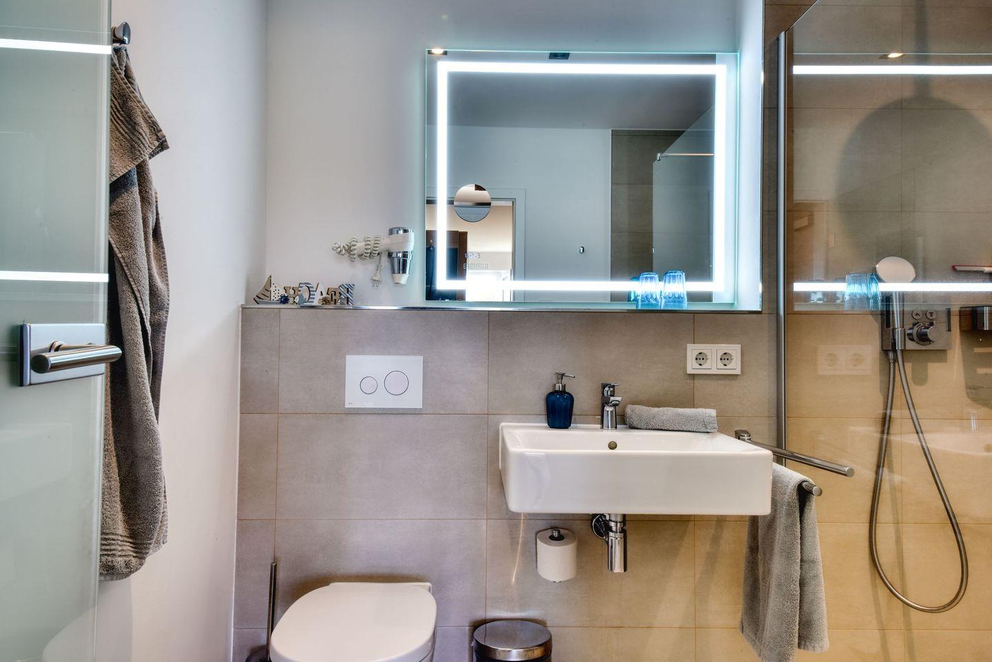 Badezimmer: Das moderne Badezimmer verfügt über eine Dusche, ein Waschbecken und eine Toilette. Handtücher und grundlegende Toilettenartikel sind für Sie bereitgestellt.