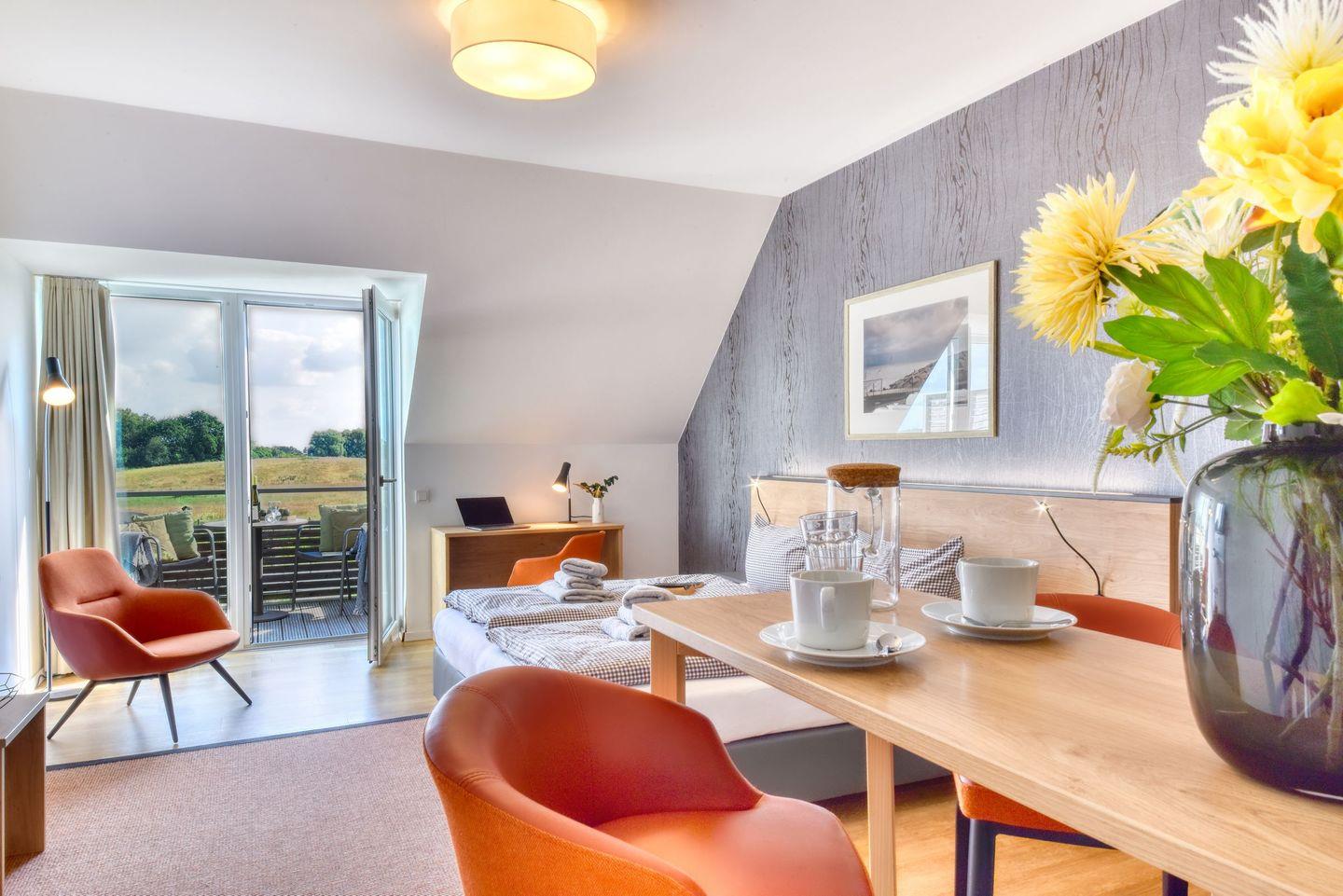 Wohnzimmer: Im gemütlichen Wohnzimmer erwartet Sie ein großzügiges Doppelbett, Hier können Sie nach einem erlebnisreichen Tag entspannen, TV schauen oder einfach den Blick in die Natur genießen.