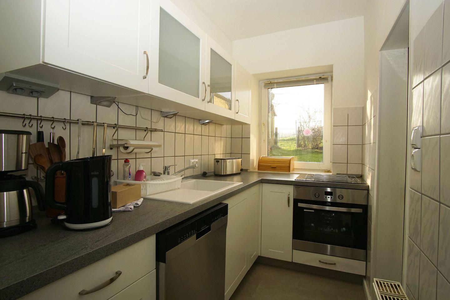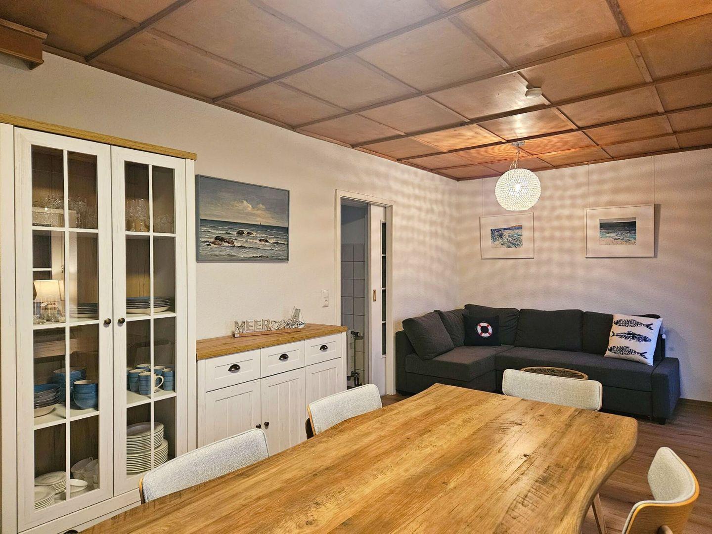 KÜCHE // separate Küche, angrenzend zum Wohnzimmer, 4-Felder Ceranfeld, Spülmaschine, Kühlschrank mit Gefrierfach, Backofen, Toaster, Wasserkocher, Kaffeemaschine, reichlich Besteck, Geschirr und Küchenutensilien, Waschmaschine im Vorratsraum ++