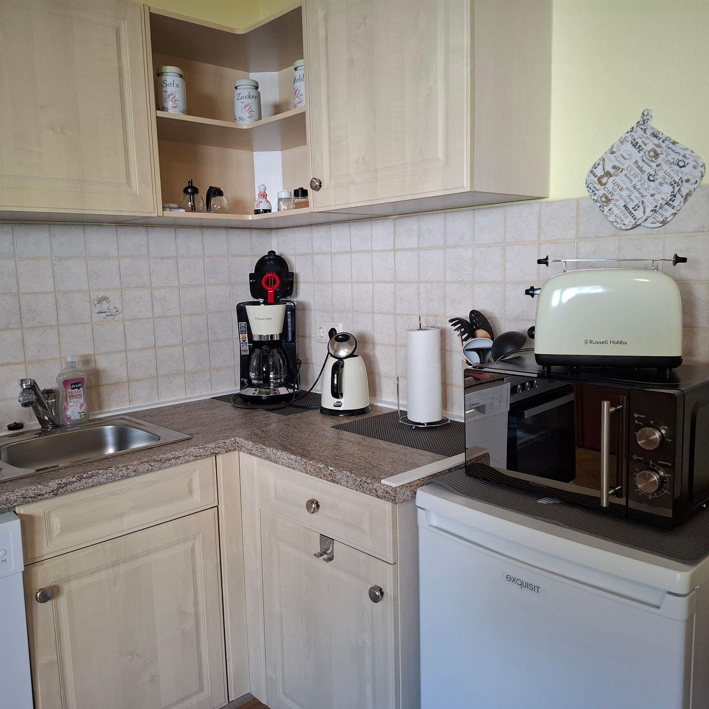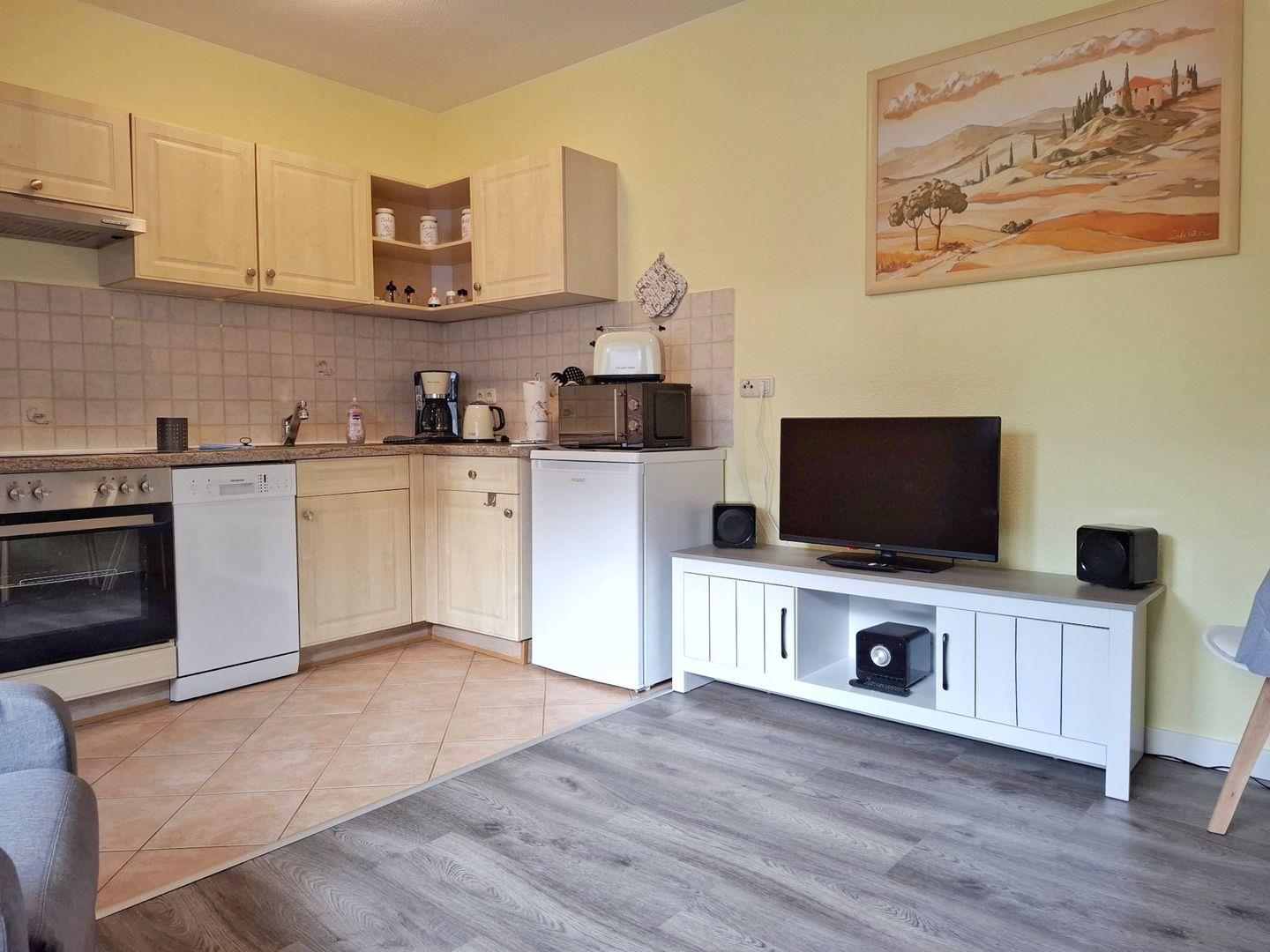 Die Wohnung ist mit einer offenen Küche ausgestattet, die sich zum Wohnzimmer hin öffnet und mit modernen Annehmlichkeiten versehen ist. Dazu zählen ein Cerankochfeld, ein Backofen, eine Mikrowelle, eine Spülmaschine sowie sämtliche Küchenutensilien und Geschirr. Hier können Sie gemütlich Ihre Mahlzeiten zubereiten und genießen. Der Essbereich, der im Wohnbereich integriert ist, lädt zum Verweilen und gemeinsamen Speisen ein. Zum Entspannen gibt es im Wohnbereich 2 individuell verstellbare Relax-Sessel.