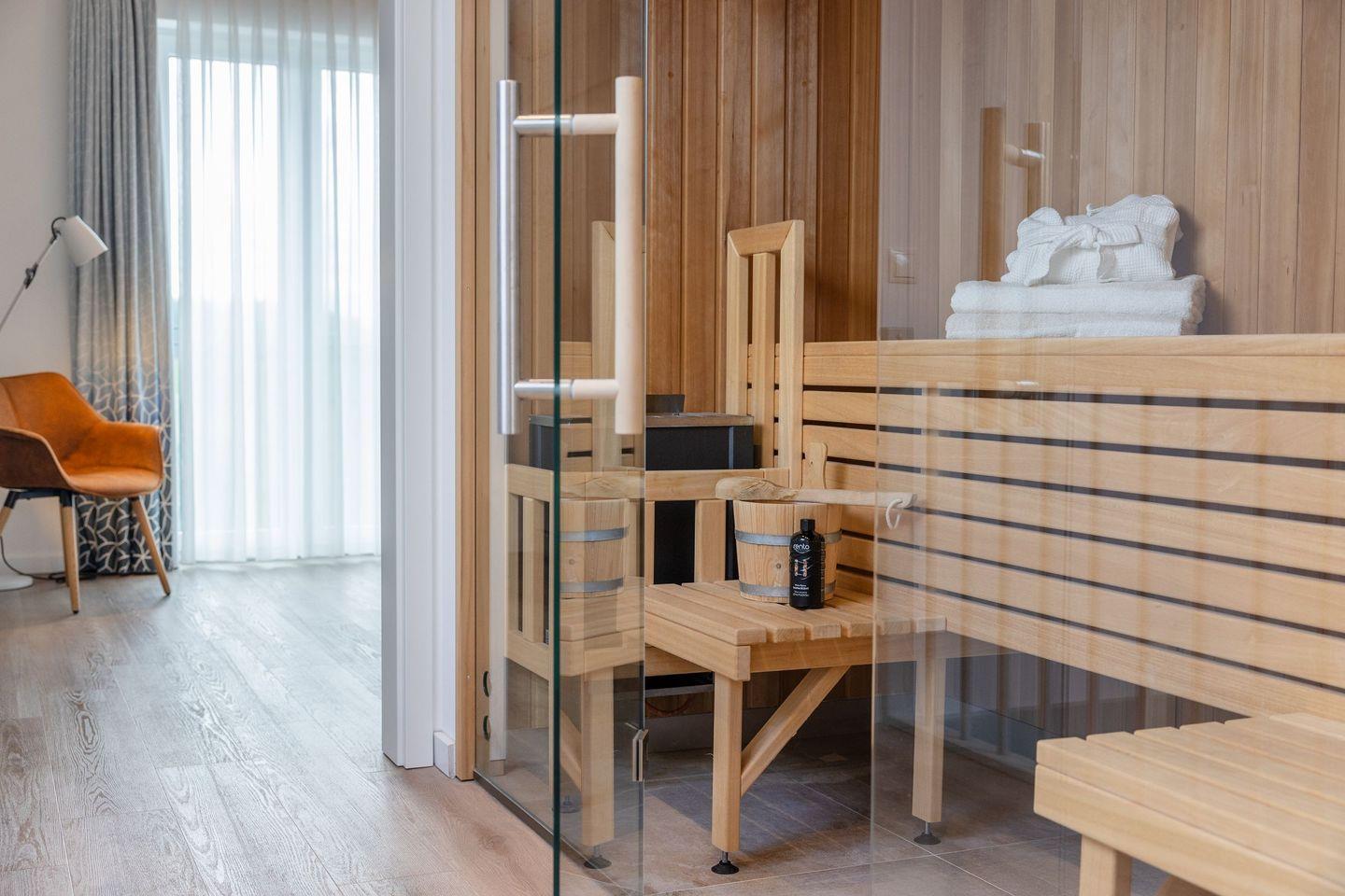 Für Wellnessorientierte Gäste steht im Ferienhaus eine private Sauna zur Eigennutzung bereit. Passende Wellnesspakete können im Hotel Nautilus käuflich erworben werden und runden das Wohlfühlerlebnis perfekt ab. Der angrenzende Garten mit Gartenmöbeln lädt zum Entspannen im Freien ein und bietet einen schönen Gartenblick. Eine Terrasse ergänzt den Außenbereiche und ist ideal für gemeinsame Mahlzeiten oder gemütliche Stunden im Freien.