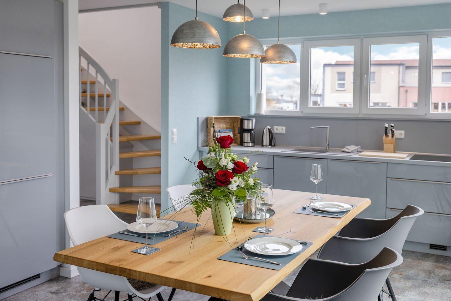 Die offene Küche ist ansprechend in den Wohnbereich integriert. Sie ist mit einem Ceran-Herd, Elektro-Backofen, Kühlschrank, Spülmaschine sowie allen notwendigen Küchenutensilien ausgestattet und verfügt über ausreichend Geschirr und Besteck. Zur Grundausstattung gehören auch Waschmaschine, Trockner, Wäscheständer, Bügeleisen, Bügelbrett sowie ein Staubsauger. Für Ihre Hygiene sind Handtücher, Badetücher, Kosmetikspiegel und ein Haartrockner bereitgestellt. Selbstverständlich ist Bettwäsche inbegriffen.
