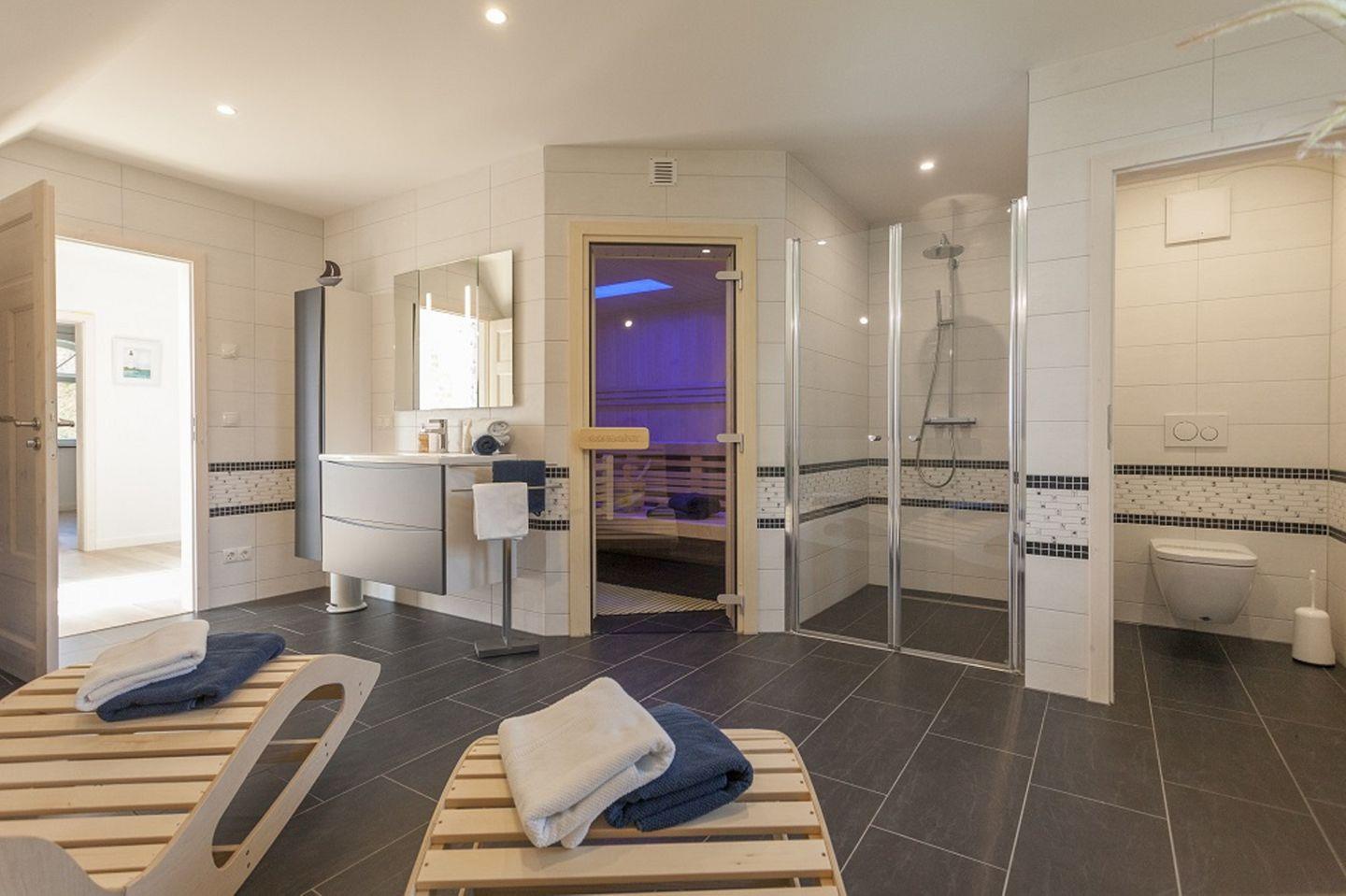BAD // großes Tageslichtbad im EG mit Dusche, WC und Badewanne, Tageslichtbad im OG mit Dusche, Sauna, Relax-Liegen und WC ++