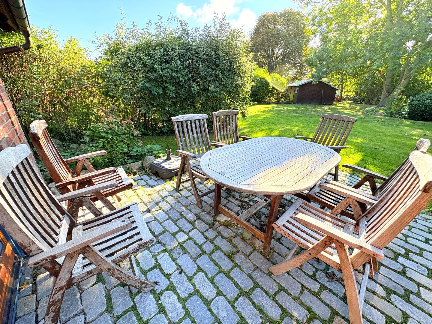 An das Haus schließt sich eine große Terrasse an, welche mit Gartenmöbeln, Auflagen und Sonnenschirm ausgestattet ist.
