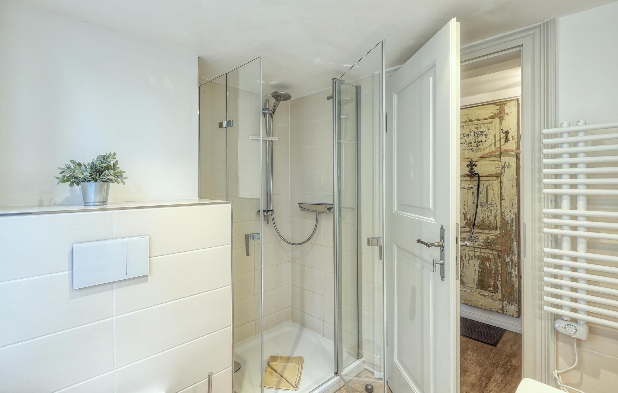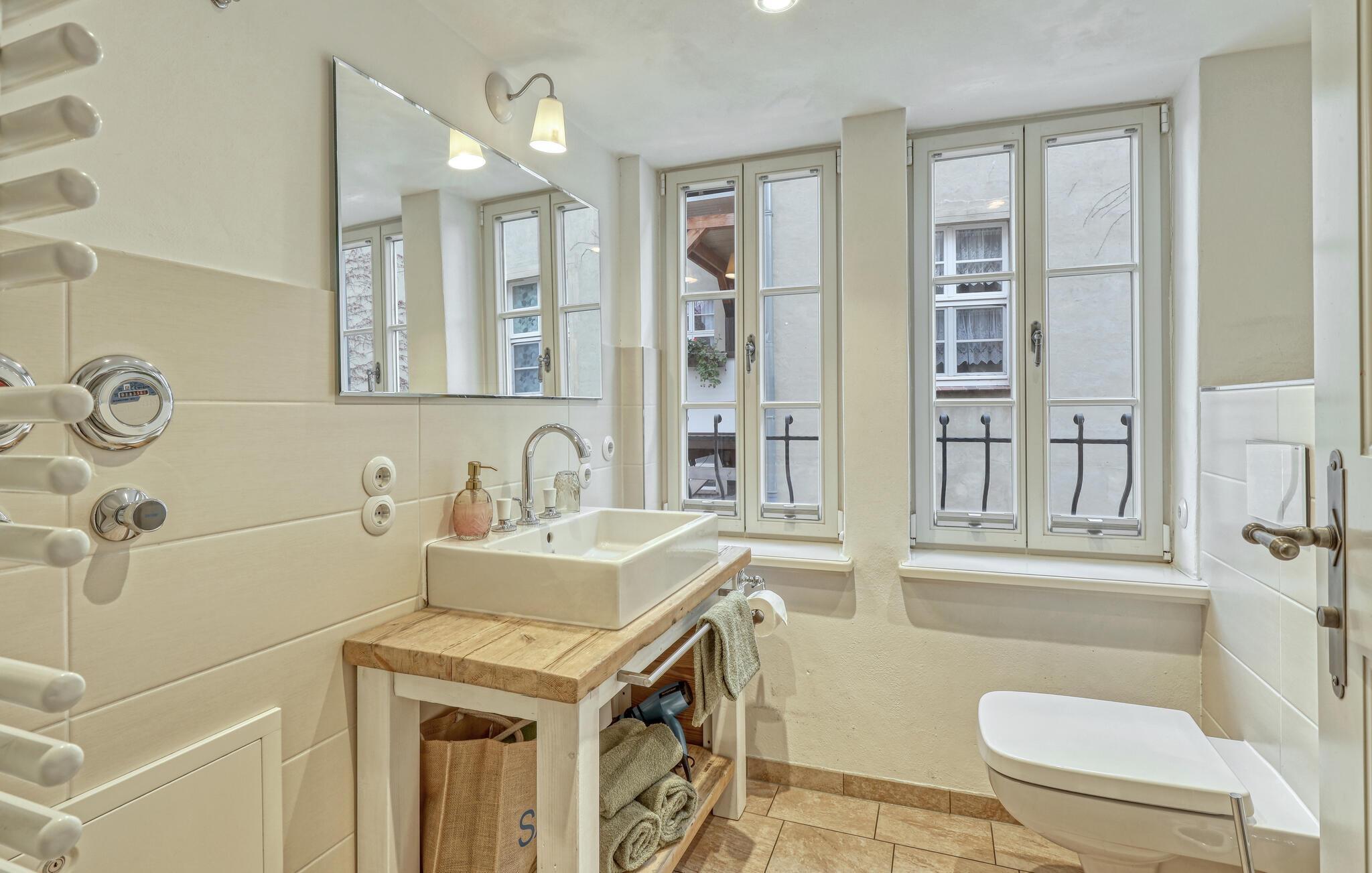 Den stilfulde træindretning i jeres stue udstråler en indbydende atmosfære. Uanset om I vil læse en bog, slappe af eller se fjernsyn, finder I her det ideelle sted til afslapning. Det åbne køkken er funktionelt udstyret, så I nemt kan tilberede lækre måltider. Den lyse spisestue med sine store vinduer danner den perfekte ramme for en fælles morgenmad eller en hyggelig middag. Nyd også den smukke udsigt over byens tage fra jeres balkon.