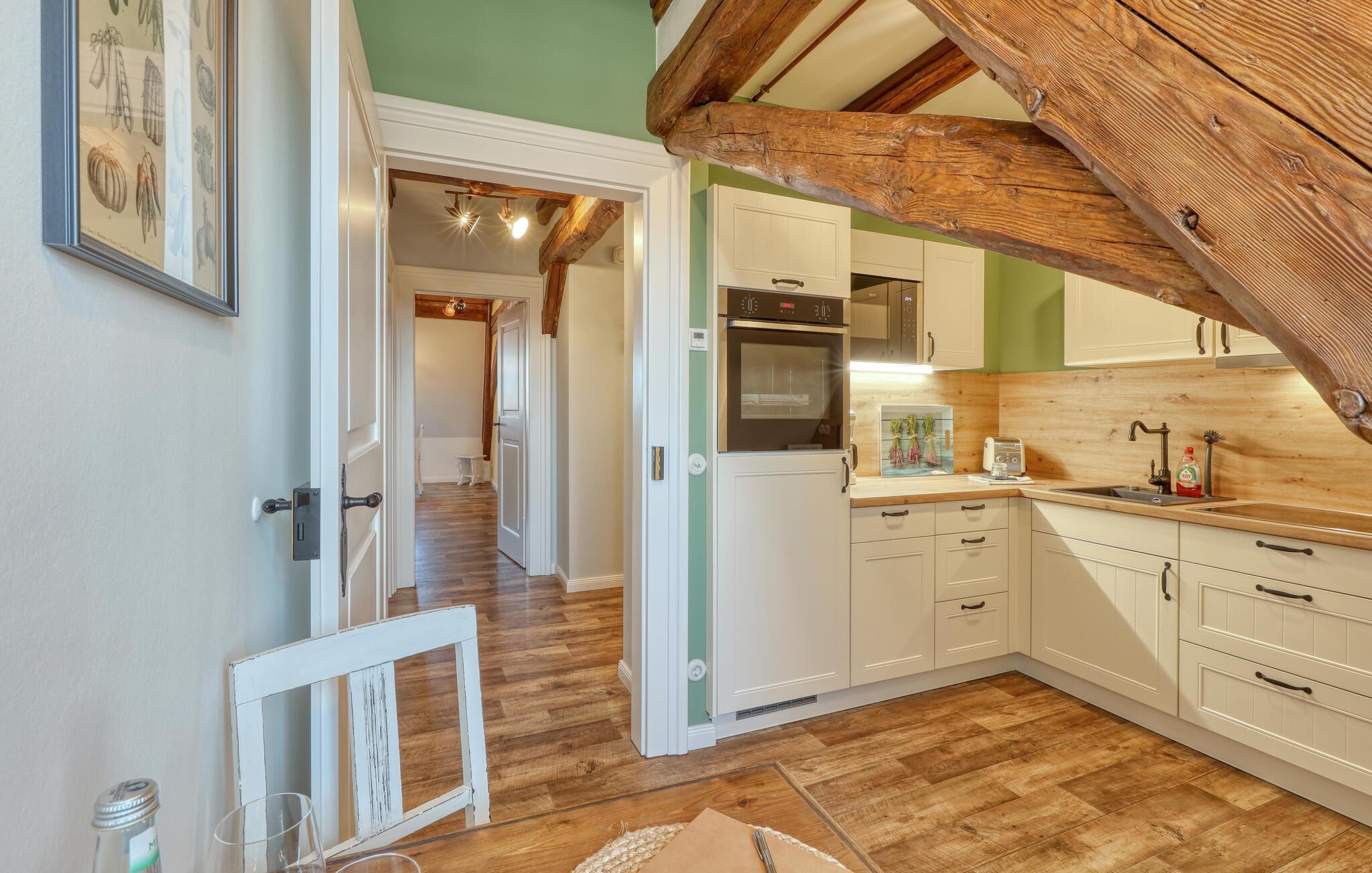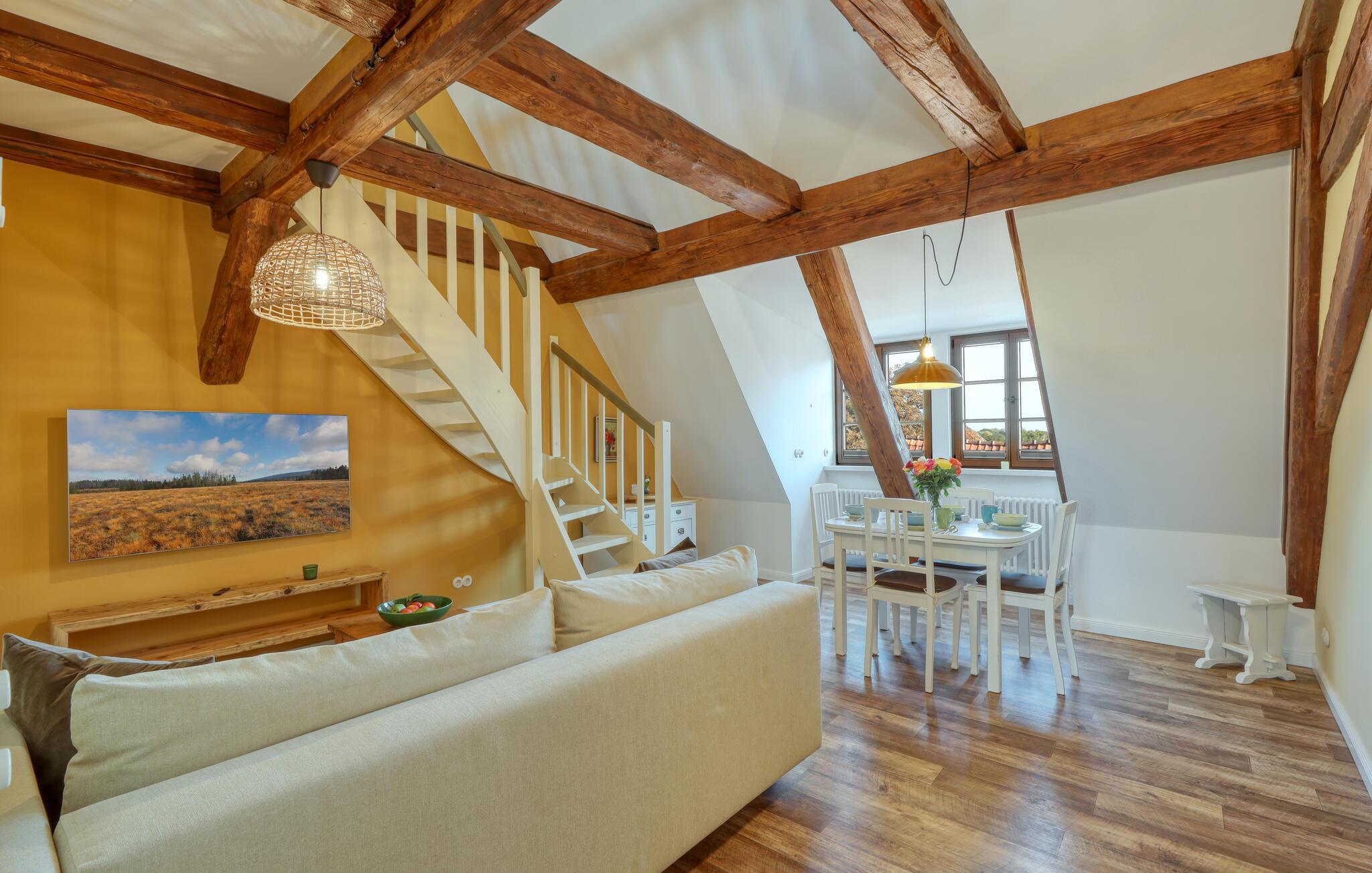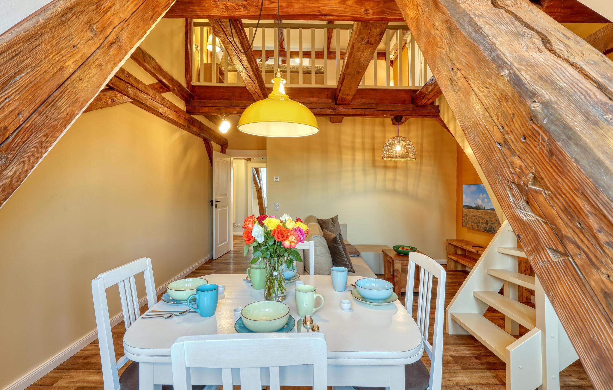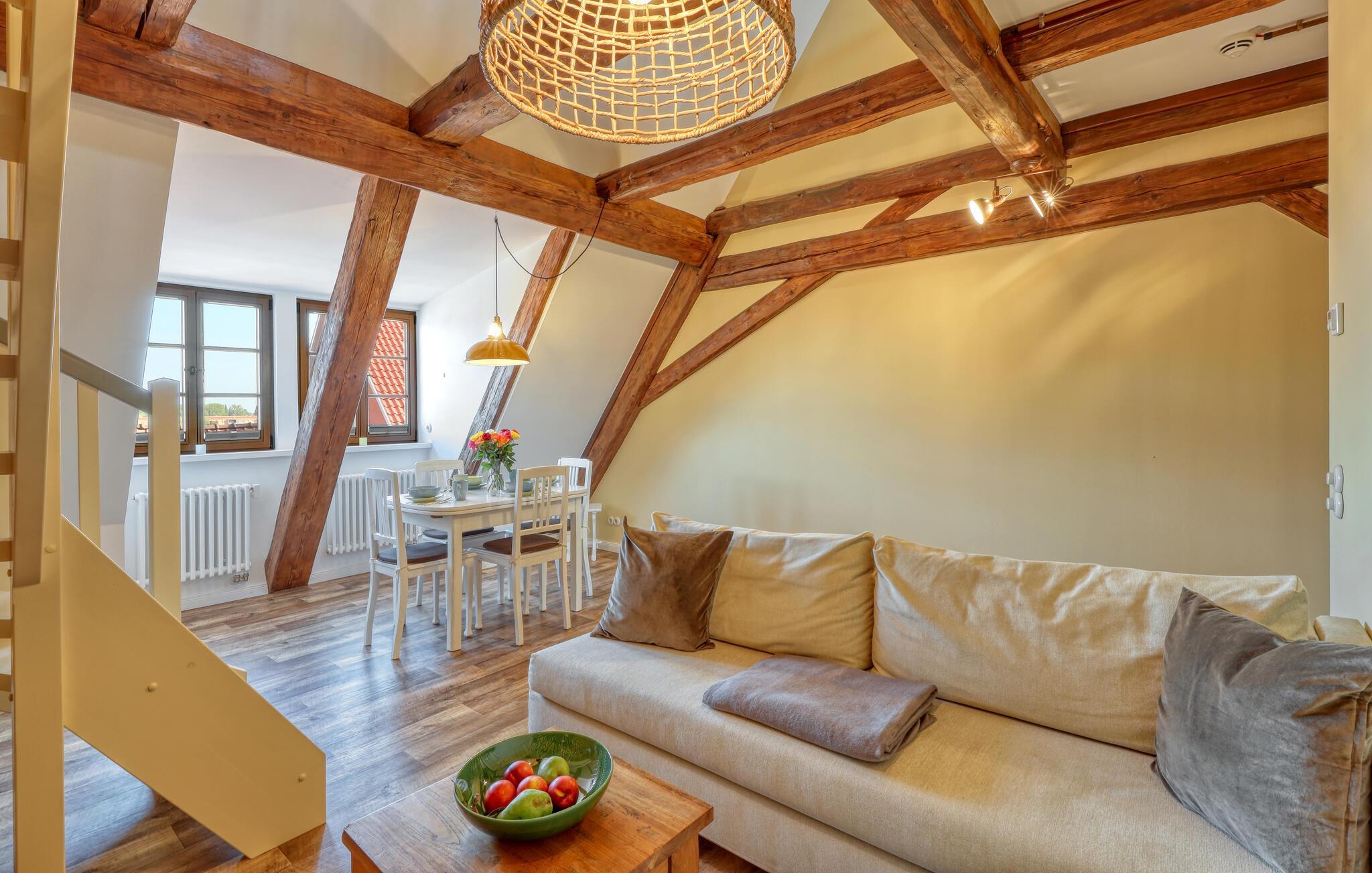 Velkommen til denne skønne lejlighed, som byder sine gæster velkommen med lyse, stilfuldt indrettede værelser i en historisk bygning, hvis lange historie ikke mindst viser sig i de dekorative træbjælker. Føl jer godt tilpas her med dine kære og nyd komforten og den smagfulde atmosfære. Slap af i saunaen, som deles med andre gæster, og hold jer i form selv på ferien med fitnessudstyret. Nyd din første kaffe og et par solstråler på terrassen, inden I begiver jer ud i dine aktiviteter.