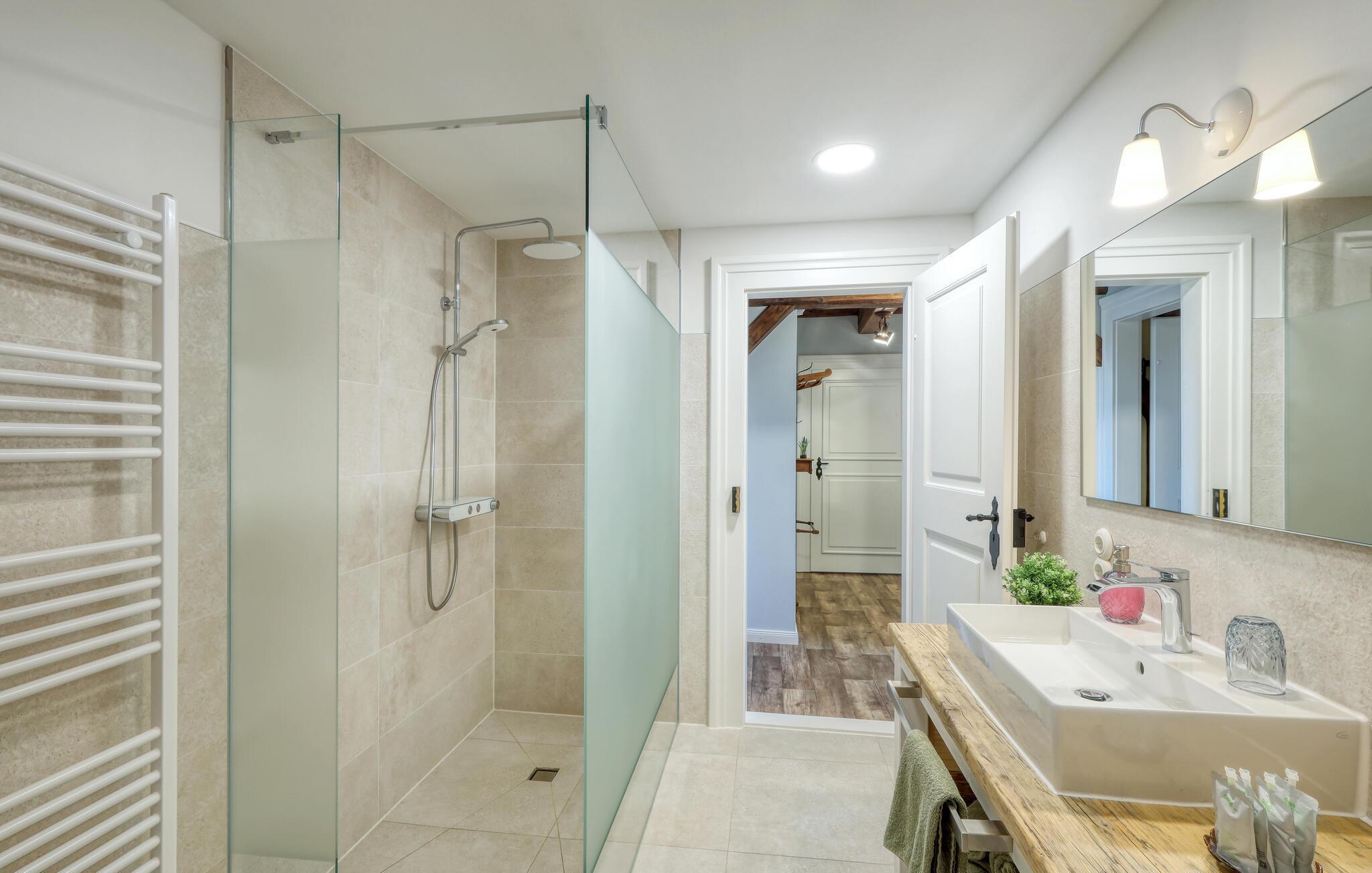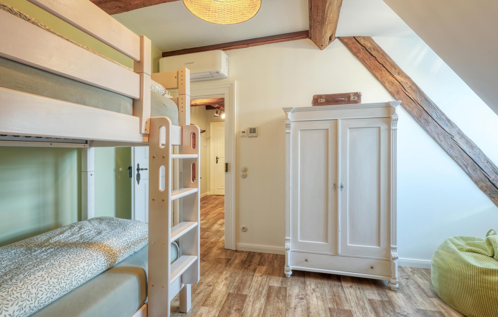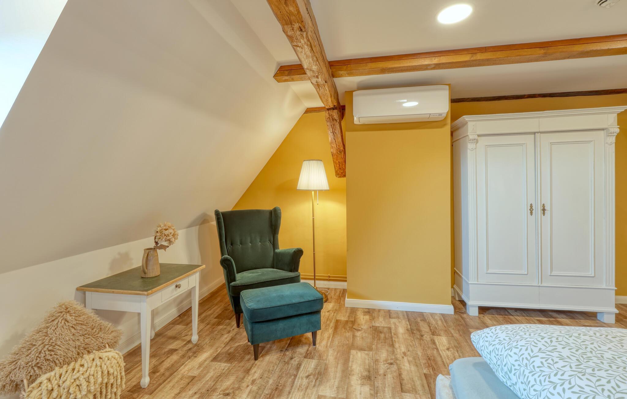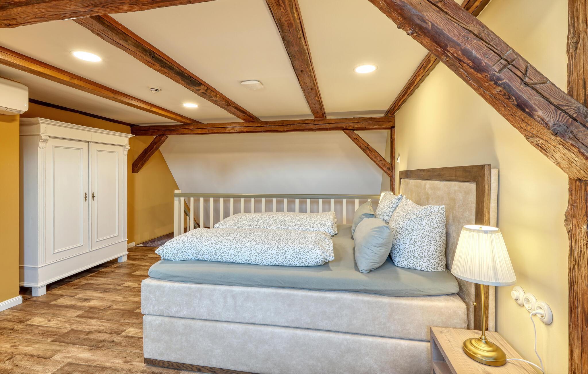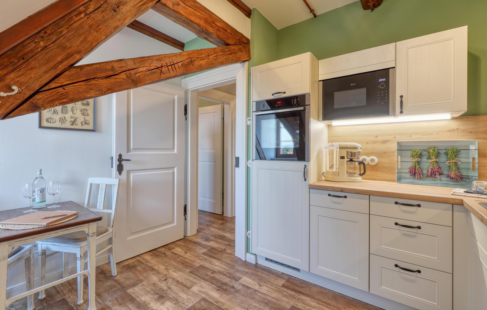 Velkommen til denne skønne lejlighed, som byder sine gæster velkommen med lyse, stilfuldt indrettede værelser i en historisk bygning, hvis lange historie ikke mindst viser sig i de dekorative træbjælker. Føl jer godt tilpas her med dine kære og nyd komforten og den smagfulde atmosfære. Slap af i saunaen, som deles med andre gæster, og hold jer i form selv på ferien med fitnessudstyret. Nyd din første kaffe og et par solstråler på terrassen, inden I begiver jer ud i dine aktiviteter.