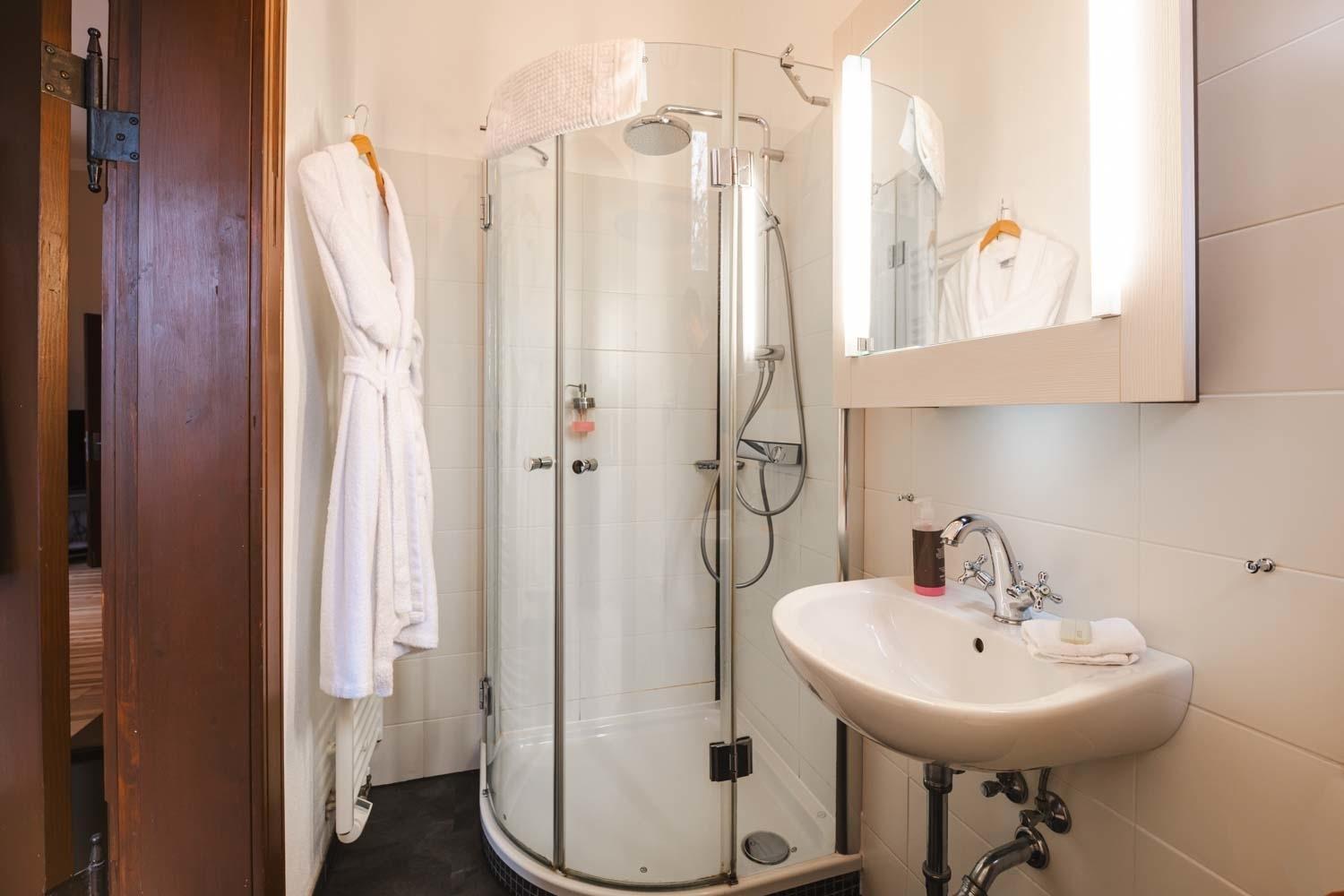 Das Badezimmer ist modern und funktional gestaltet, ausgestattet mit einer Duschkabine.