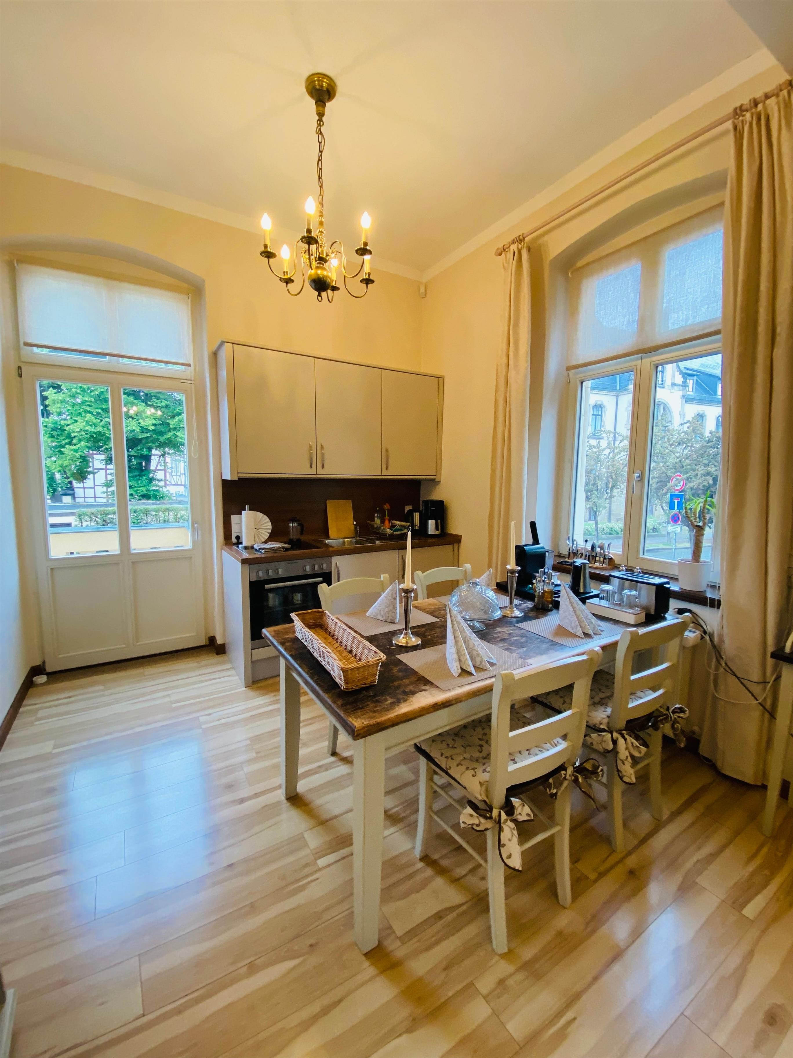 Der Wohnbereich ist geräumig und geschmackvoll eingerichtet, wobei große Fenster für eine helle und luftige Atmosphäre sorgen. Eine moderne, voll ausgestattete Küche mit hochwertigen Geräten bietet die Möglichkeit zur Selbstverpflegung. Der Essbereich ist gemütlich gestaltet und eignet sich perfekt für entspannte Mahlzeiten.