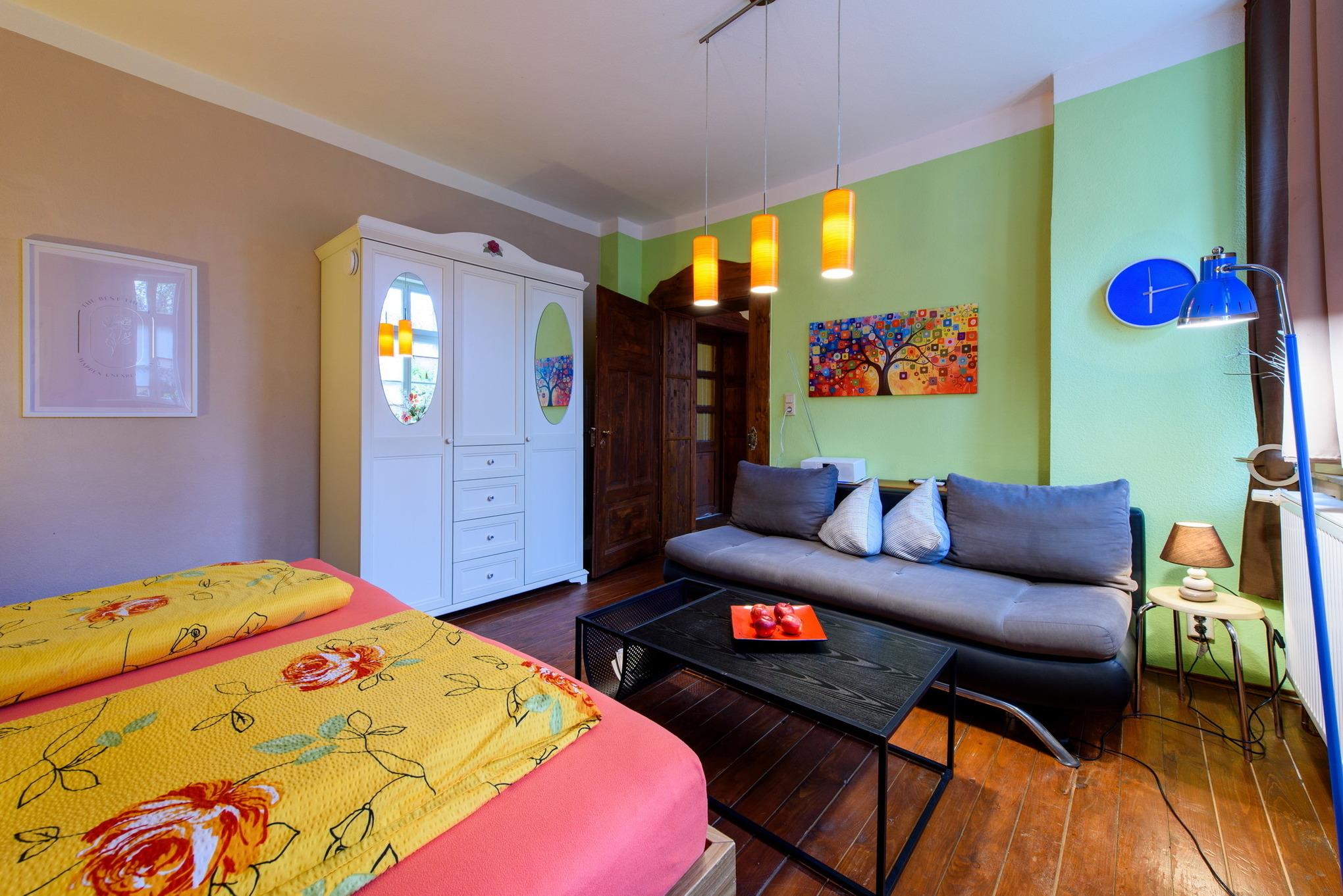 einer modernen Küche und einem Bad (insgesamt 40qm). Hier sind die Zimmer nicht nur farbenfroh und hell gestaltet, sondern strahlen ein wenig das Flair der Sechziger aus. Für einen weiteren Gast ist die Ledercouch schnell zu einer Schlafgelegenheit umfunktioniert. Als sehr angenehm wird die sehr ruhige Lage empfunden, so dass Sie auch bei offenem Fenster wundervoll schlafen können.