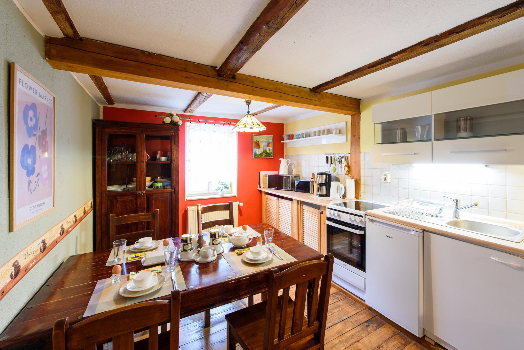 Mit ihren 70qm ist dies unsere größte Wohnung. Das Besondere an ihr ist das rustikal eingerichtete Wohnzimmer, das mit seinem alten Gebälk die dort angrenzende Küche als einen Raum erscheinen lässt. Die zwei ruhig gelegenen Schlafzimmer besitzen jeweils einen separaten Zugang zum großen Familienbad, das sowohl eine Badewanne, als auch eine Dusche aufweist. Mit einer zusätzlichen Aufbettung kann aufgewartet werden.