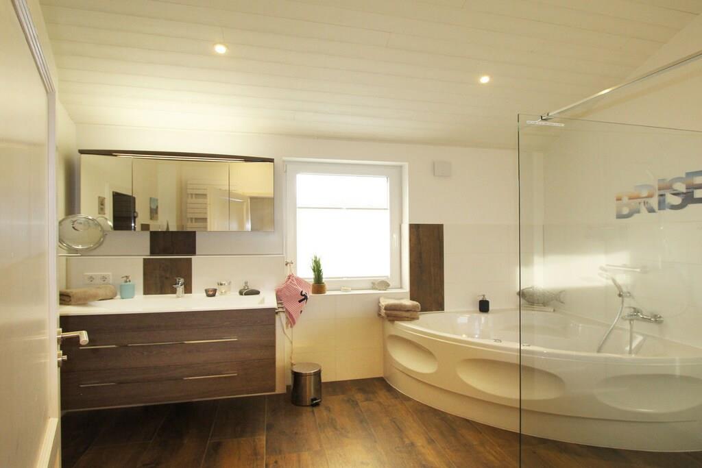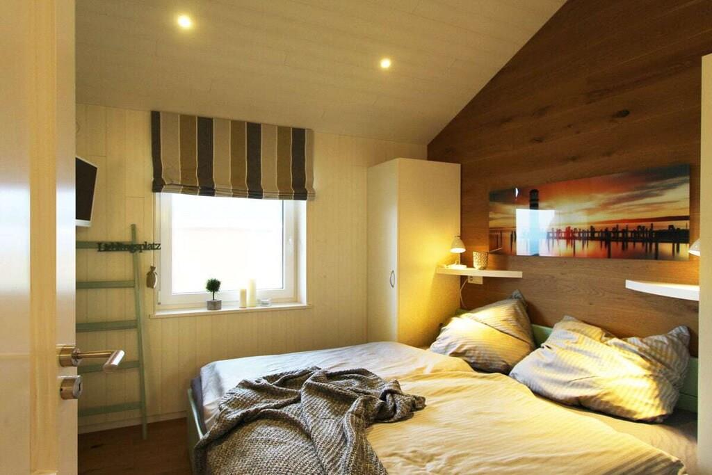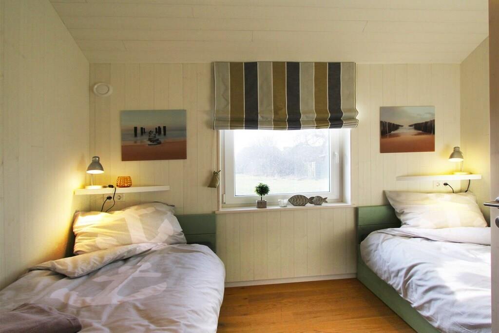 Dette rummelige feriehus er ideelt for hele familien. Opholds- og spisestuen er lys og indbydende takket være karnapvinduet og de store døre. Det åbne køkken med morgenmadsbar er direkte forbundet med opholdsstuen og har direkte adgang til de smukke, overdækkede terrasser, der strækker sig over stuen. Opholdsstuen har en lille brændeovn til hyggelige aftener. Det store badeværelse er udstyret med sauna og spabad. Feriehuset har tre komfortable dobbeltsenge (180 x 200 cm). Der er også et soveværelse med to enkeltsenge. En stor, komfortabel hems med en dobbeltmadras (180 x 200 cm) er ideel til børn.