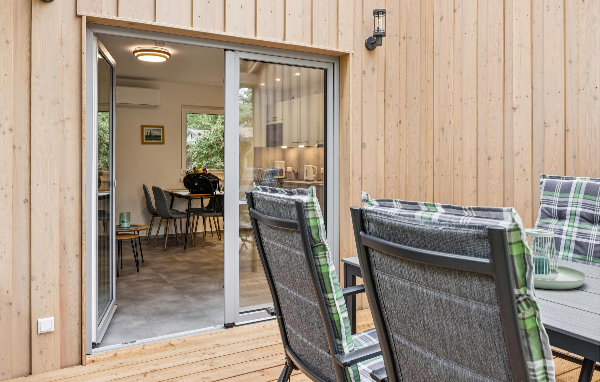 Træd ud på den overdækkede terrasse og begynd dagene med morgenmad i den friske luft. Brug siddeområdet til at slappe af i skyggen eller observere naturen med en kop kaffe. Udforsk den velholdte have, omgivet af høje træer, der tilbyder privatliv og en naturlig atmosfære. Gennem træerne kan I se det glitrende vand i Müritz-floden. Lad aftenen slutte fredeligt, mens I lytter til træernes raslen i brisen.