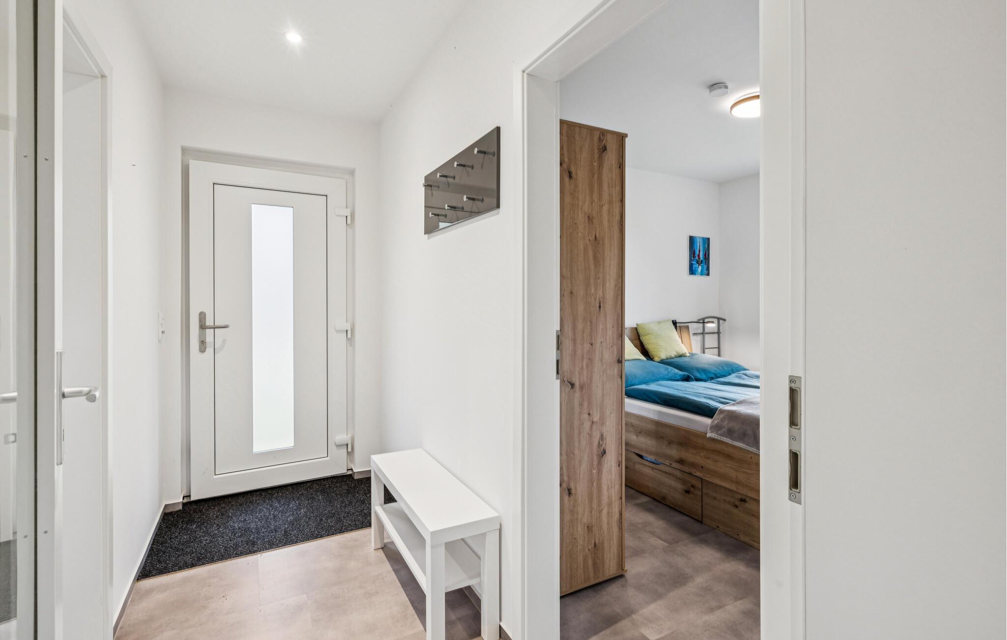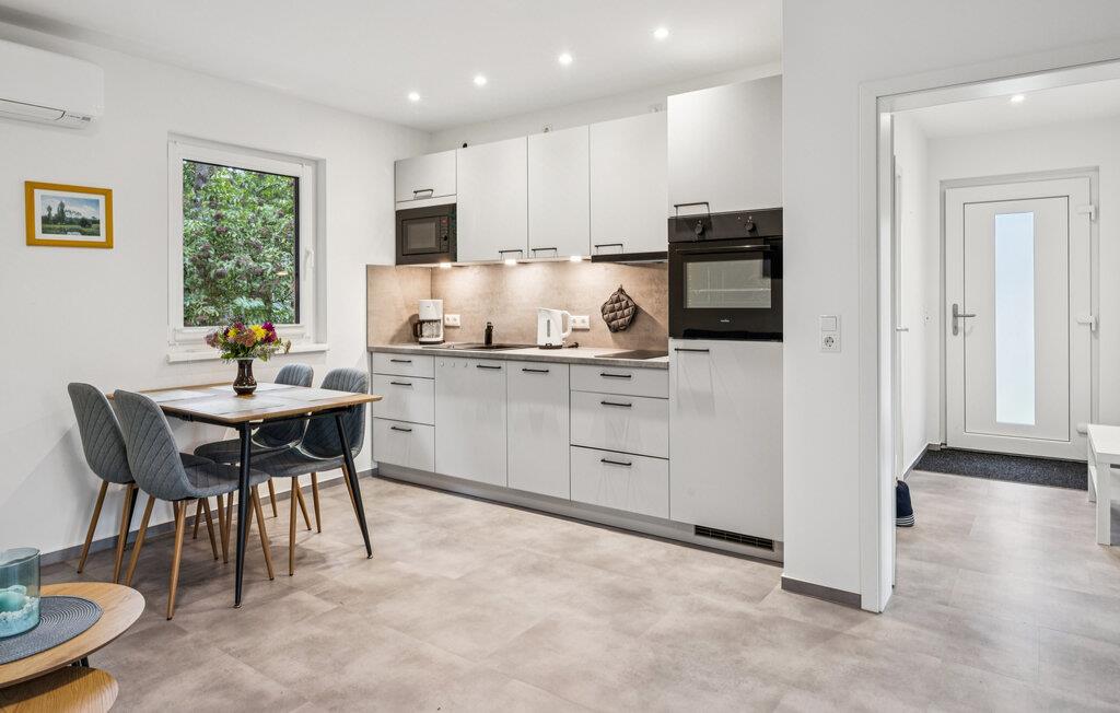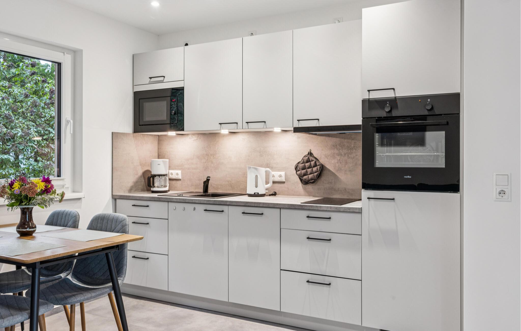 Læn jer tilbage i den lyse opholdsstue med moderne møbler og en indbydende indretning. Gør jer selv komfortabel i den behagelige sofa eller sæt jer ved spisebordet ved siden af ??det moderne, åbne køkken, ideelt til underholdning.