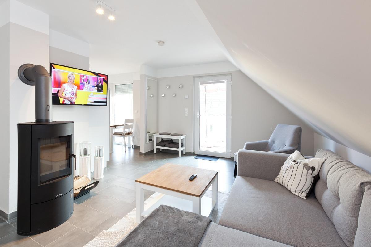 Die Ferienwohnung befindet sich im Dachgeschoss, in ruhiger Lage. Modern, gemütlich und tolles Ambiente. Ausgestattet mit 2 Schlafzimmern, einer Koch- und Wohnlandschaft, einem Kamin, einem Balkon und einer Fasssauna. Unsere Doppelboxspringbetten bieten eine angenehme Nachtruhe. Die Fenster besitzen Aussenrollos und Fliegengitter. Auf der Terrasse befindet sich ein fester Grill mit dazugehörigen Gartenmöbel. Für Familien mit Kindern, kann ein Kinderreisebett und ein Hochstuhl von uns zusätzlich aufgestellt werden, auf Anfrage. Ein PKW- Stellplatz befindet sich direkt an der Unterkunft.