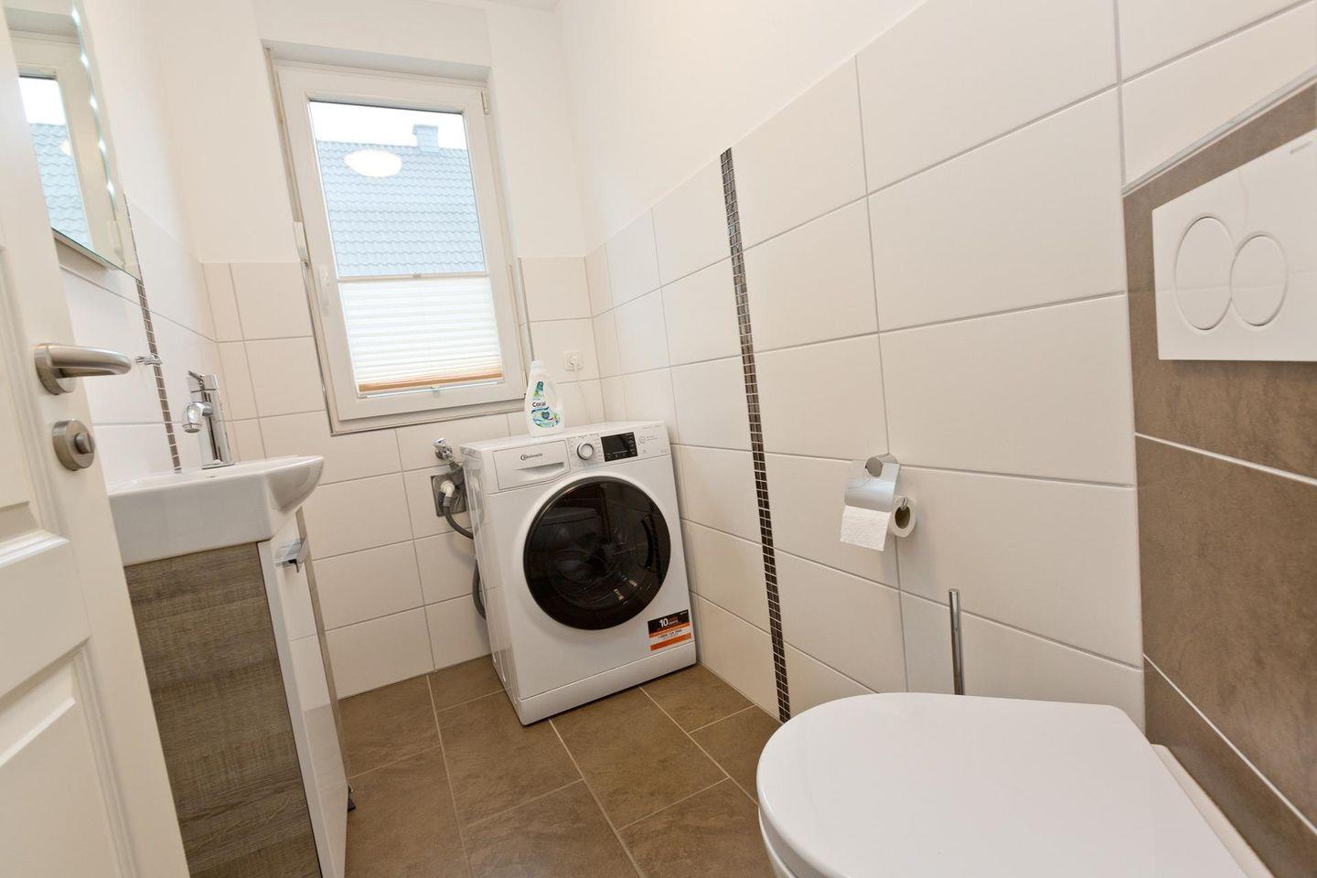 Im Bad befindet sich ein WC, Waschbecken, Dusche, Whirlpool und eine Infrarot-Wärmekabine.