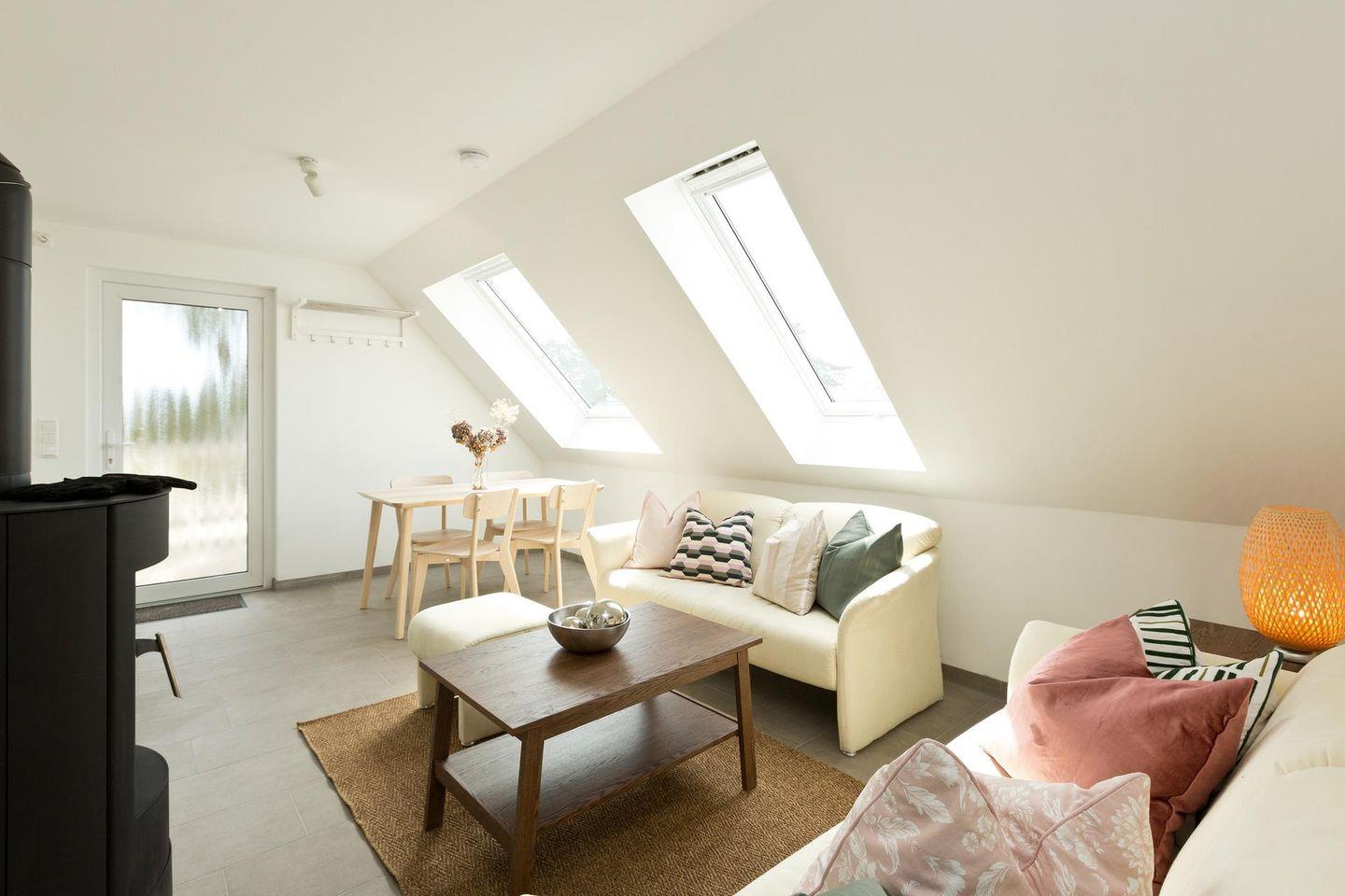 Die Ferienwohnung liegt im Obergeschoss. Geräumig und modern gestaltet. Mit großen Dachfenstern, die viel natürliches Licht hereinlassen. Die Wohnung verfügt über ein großzügigen Wohnbereich, einer voll ausgestatteten Küche, einem Bad mit ebenerdiger Dusche, einem Schlafzimmer mit einem Doppeltbett und einem weiteren Schlafzimmer mit zwei Einzelbetten. In dieser Ferienwohnung gibt es ausreichend Platz für bis zu 4 Personen.