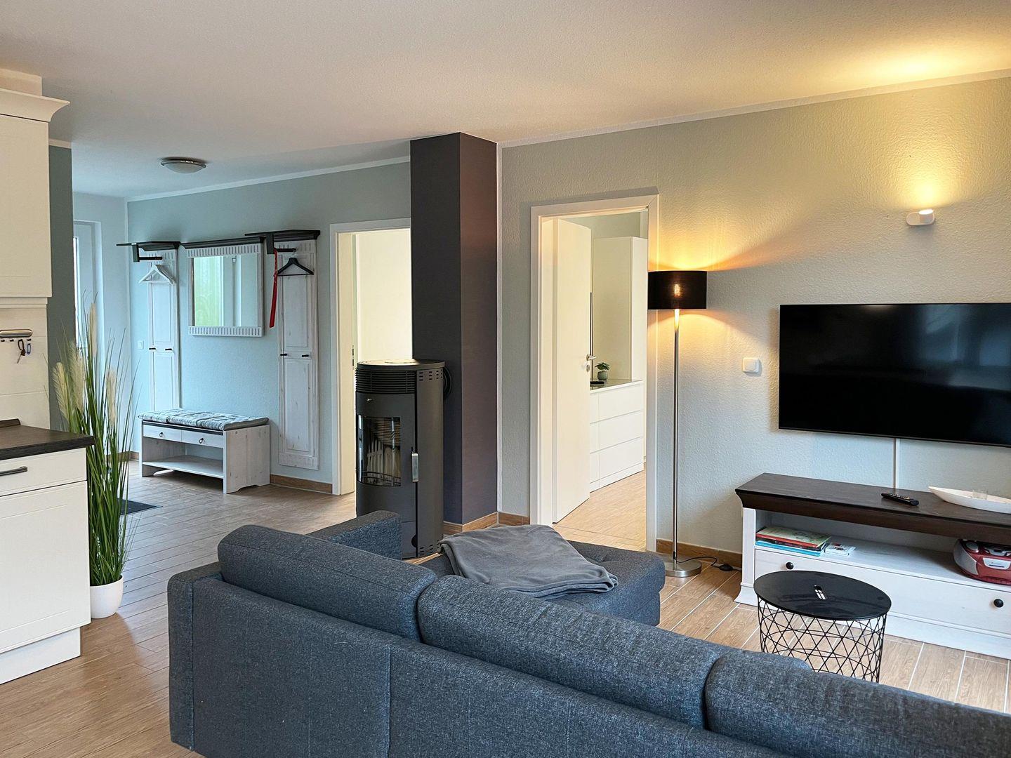 Die Wohnung bietet Platz für bis zu vier Erwachsene und ein Kind . Sie verfügt über eine moderne Einrichtung mit allem Komfort. Ausgestattet mit zwei Schlafzimmern, einem gemütlichem Wohn-/Essbereich mit offener Küche und Kamin. In dem großzügigen Bad befindet sich neben einer Dusche auch eine Badewanne und Infrarot-Wärmekabine. Auf der sonnigen Terrasse mit dazu gehörigen Gartenmöbeln, können Sie erlebnisreiche Tage ausklingen lassen. Neben dem Wohnbereich sind auch beide Schlafzimmer mit LCD-Flachbildschirmen ausgestattet. Für Familien mit Kindern, kann ein Kinderreisebett und ein Hochstuhl von uns zusätzlich aufgestellt werden. Ein PKW- Stellplatz befindet sich direkt an der Unterkunft. Fahrräder können Sie im dazugehörigen Gartenhäuschen trocken und sicher unterstellen.