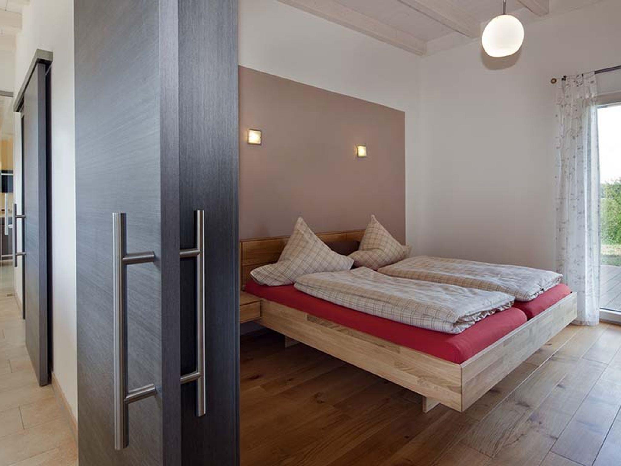 Die barrierefreie Wohnung hat ein Schlafzimmer mit Doppelbett, ein Schlafzimmer mit zwei Einzelbetten, bodengleiche Dusche, WC mit Haltegriffen und eine großzügige Wohnküche mit Panoramafenster und direktem Zugang auf die Terrasse. Hier sind Sie mit der Natur auf Tuchfühlung.