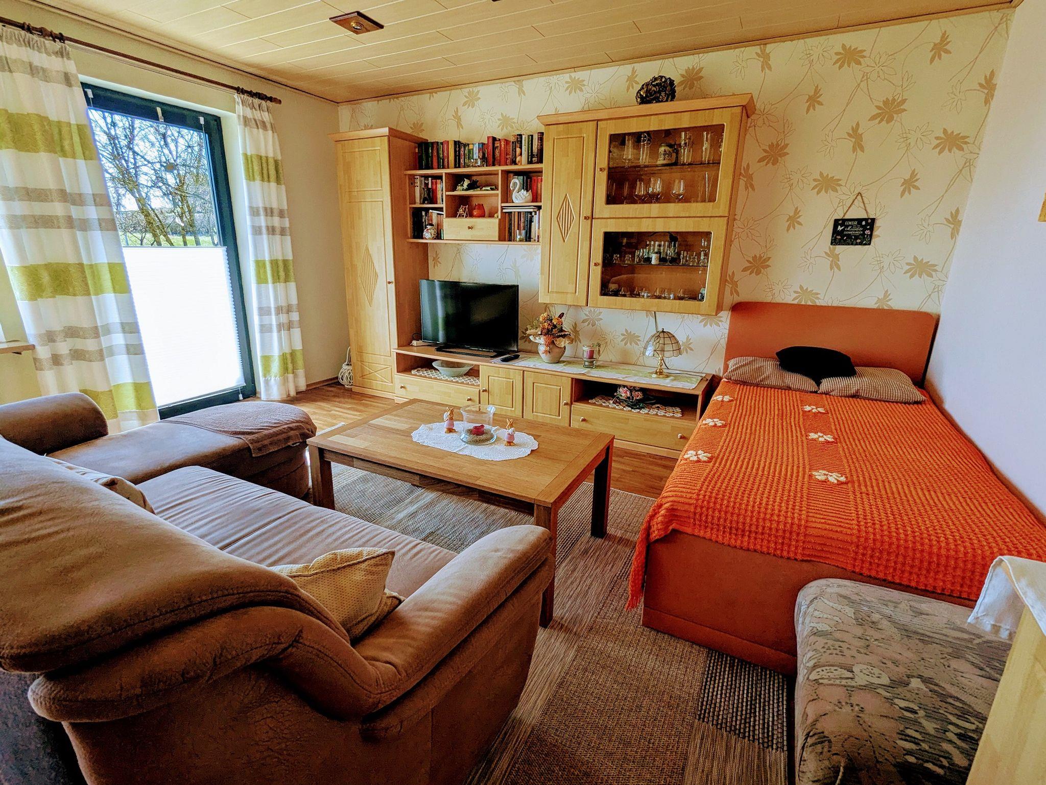 Gemütliches Wohnzimmer mit neuen Sofa, TV Flachbildschirm mit Mediathek, W-Lan, viele Bücher, Radio und CD Anlage.