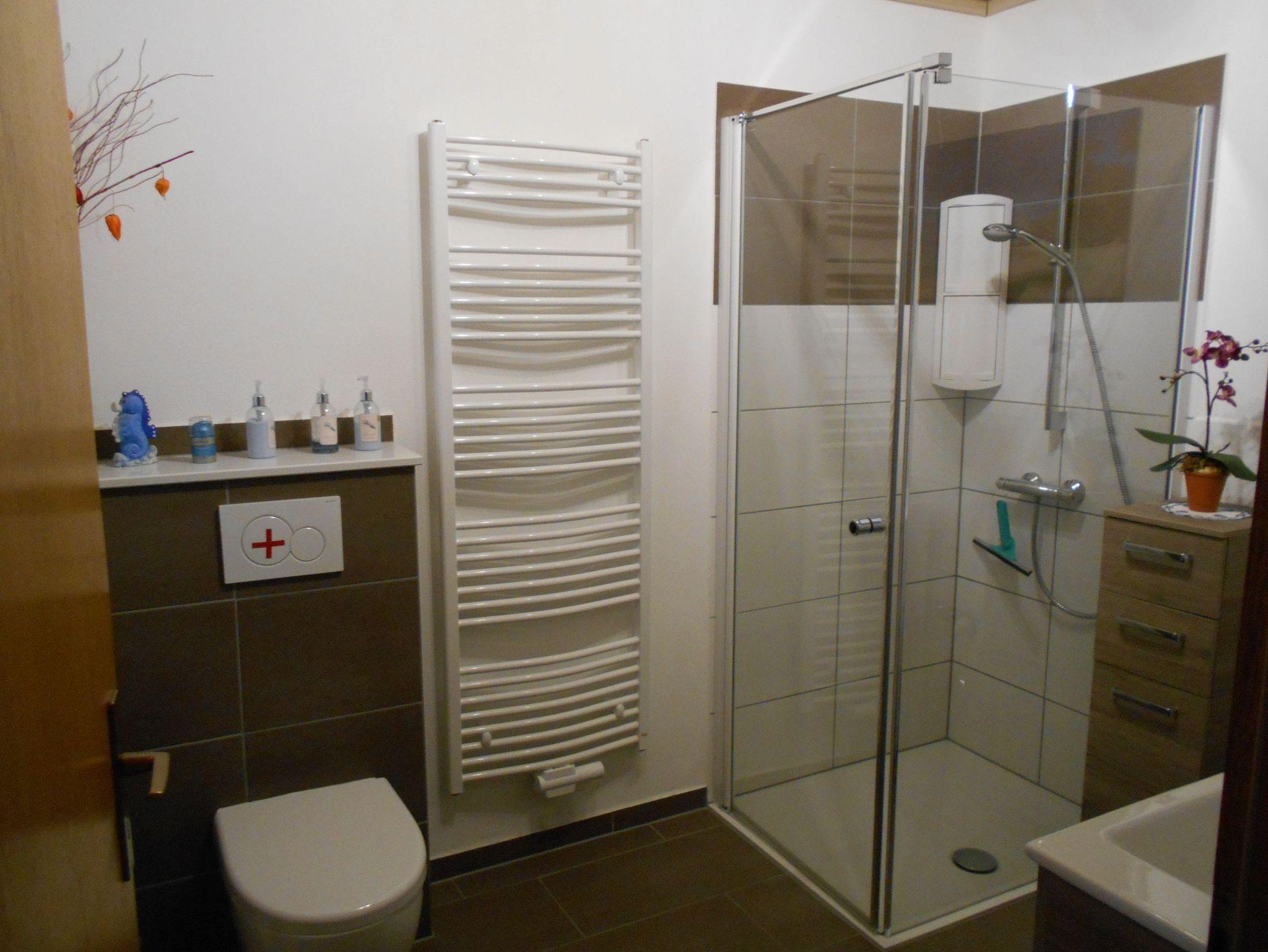 Neues Bad mit ebenerdiger Dusche, WC, Waschmaschine und Fußbodenheizung.