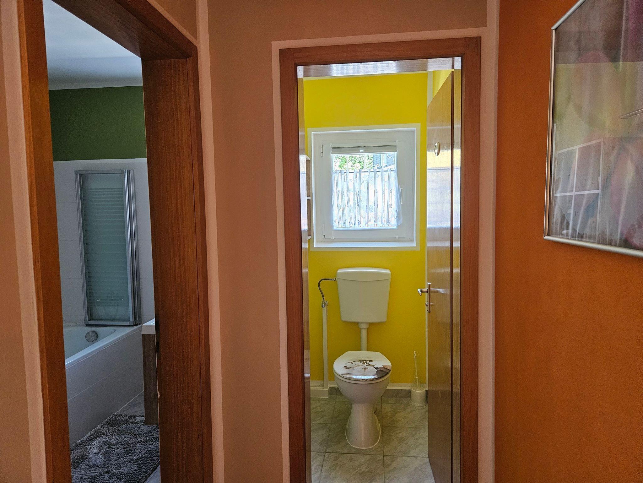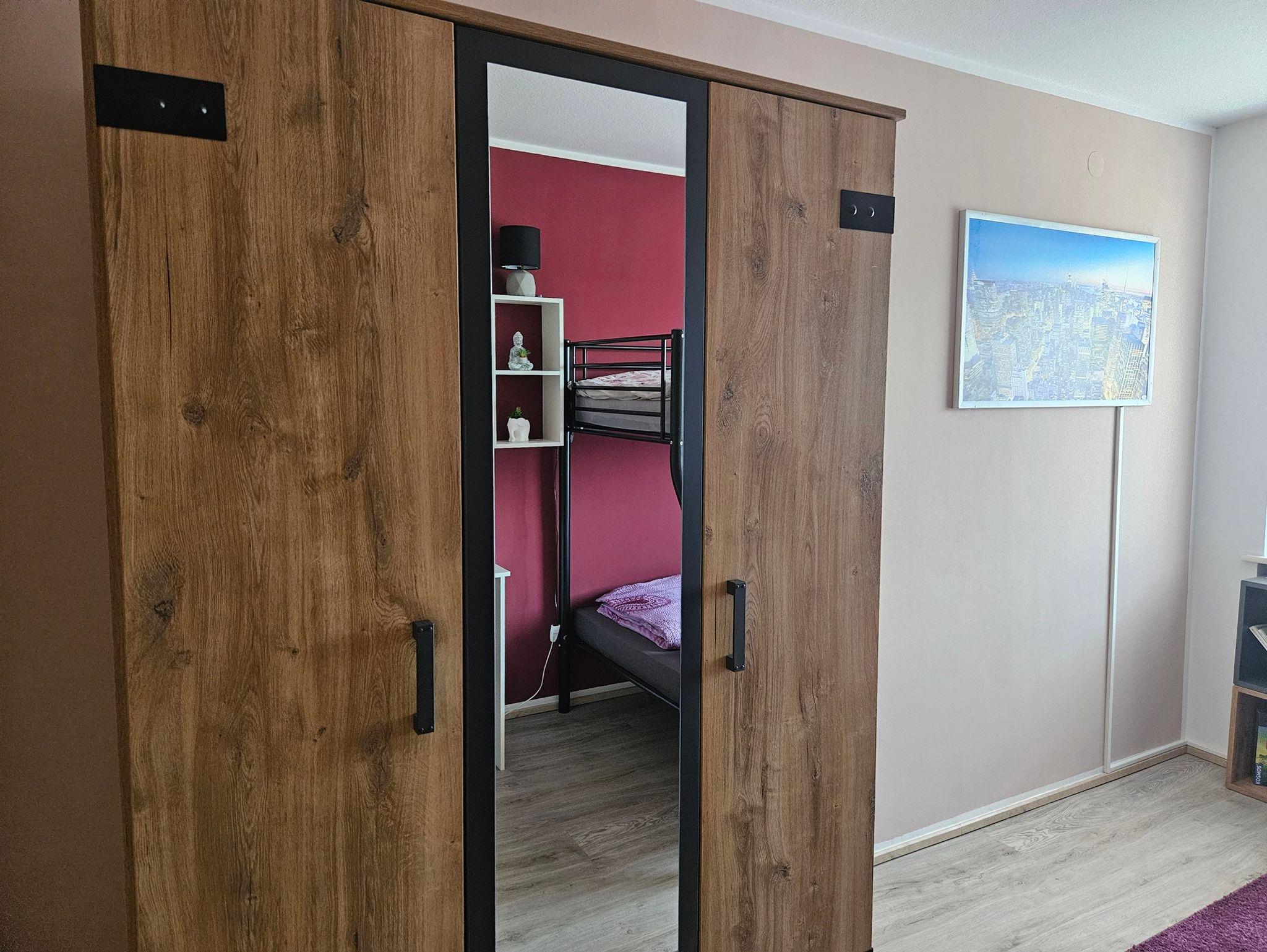 Die 120m² große Wohnung befindet sich im Erdgeschoß. Es gibt ein Schlafzimmer mit Doppelbett, großem Kleiderschrank mit Ganzkörperspiegel und Balkonzugang. Ein Kinderzimmer mit Etagenbett ( unten 140x200 oben 90x200 ),Kleiderschrank, Schreibtisch und Spielecke.