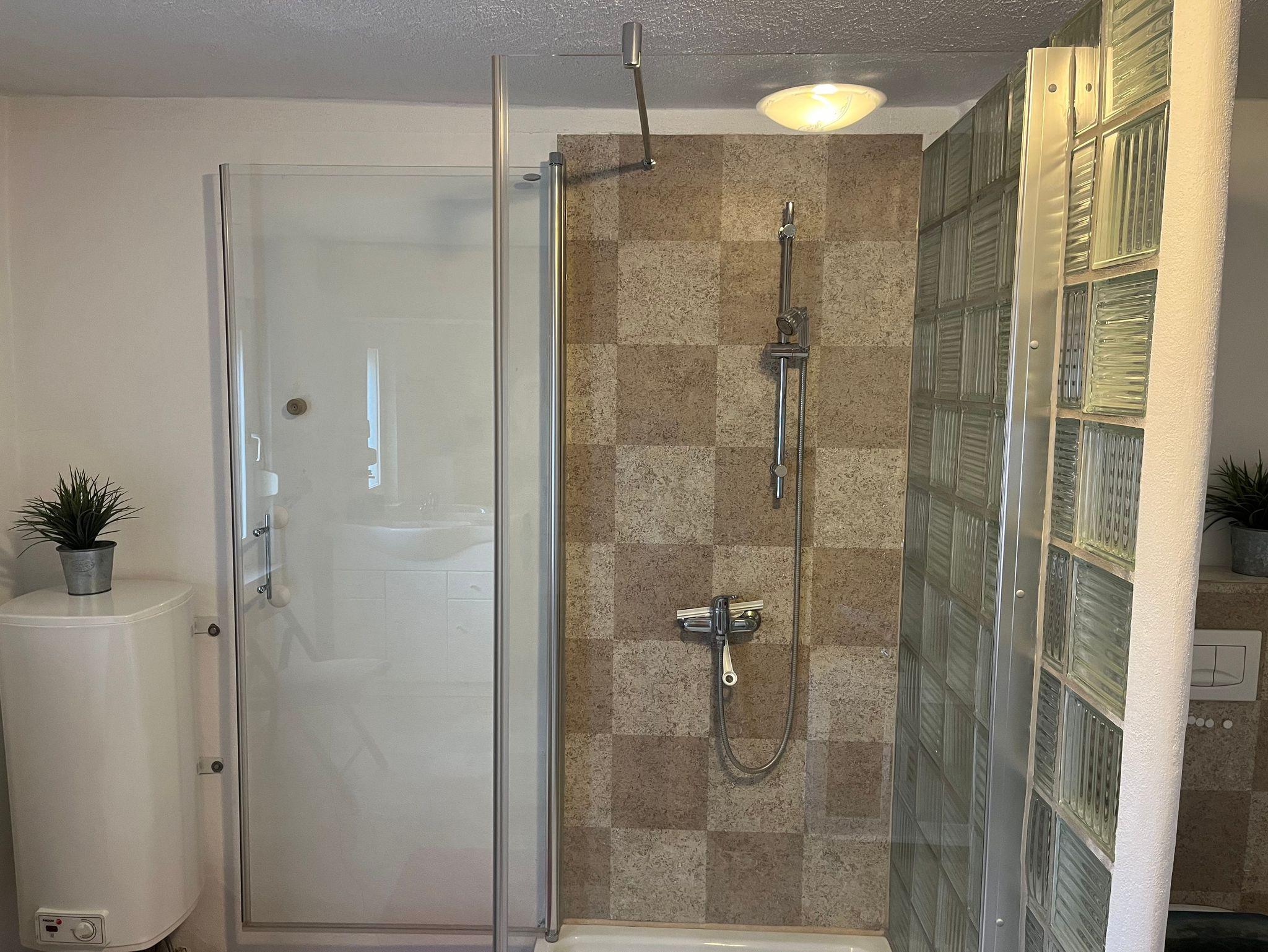 Die Ferienwohnung in Holzoptik verfügt über eine geräumige Wohnküche mit Eßecke, Wohnzimmer mit gemütliche Sitzecke, ein Schlafzimmer mit Doppelbett und großes Badezimmer mit Dusche, WC und Waschmaschine.