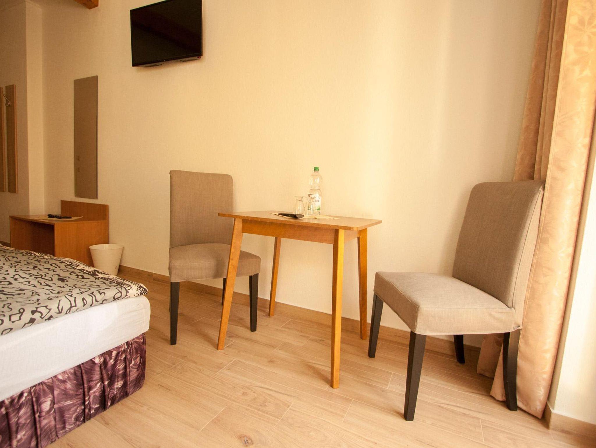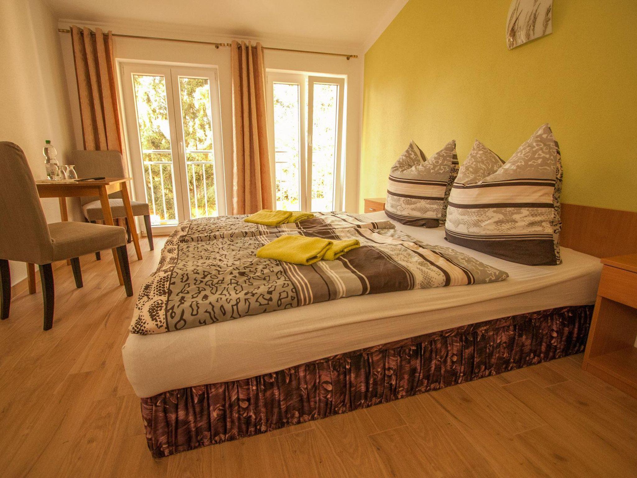Zimmer 5? ist ein schönes, helles Doppelzimmer mit fußbodenhohen Fenster mit Blick auf den Garten. Zudem bietet es ein modernes Bad mit Dusche, Sat-TV, WLAN und 2 Sitzgelegenheiten mit Tisch.