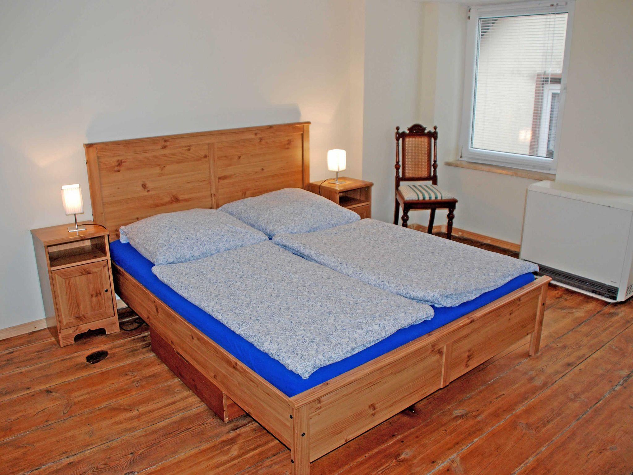 Im Schlafzimmer stehen ein bequemes Doppelbett (1,40 x 2,00 m) mit Nachttischen und Leselampen sowie ein Kleiderschrank.