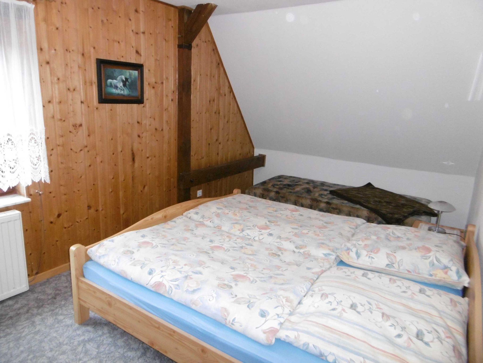 Die Ferienwohnung befindet sich im Obergeschoß und ist über eine Außentreppe mit den Balkon zu erreichen. Sie besteht aus einem gemütlich eingerichteten Wohnzimmer mit Essecke und Sitzgruppe (TV) sowie der offenen Küche, dem Schlafzimmer mit Doppelbett sowie einer Liege für Ihr Kind und dem Duschbad.